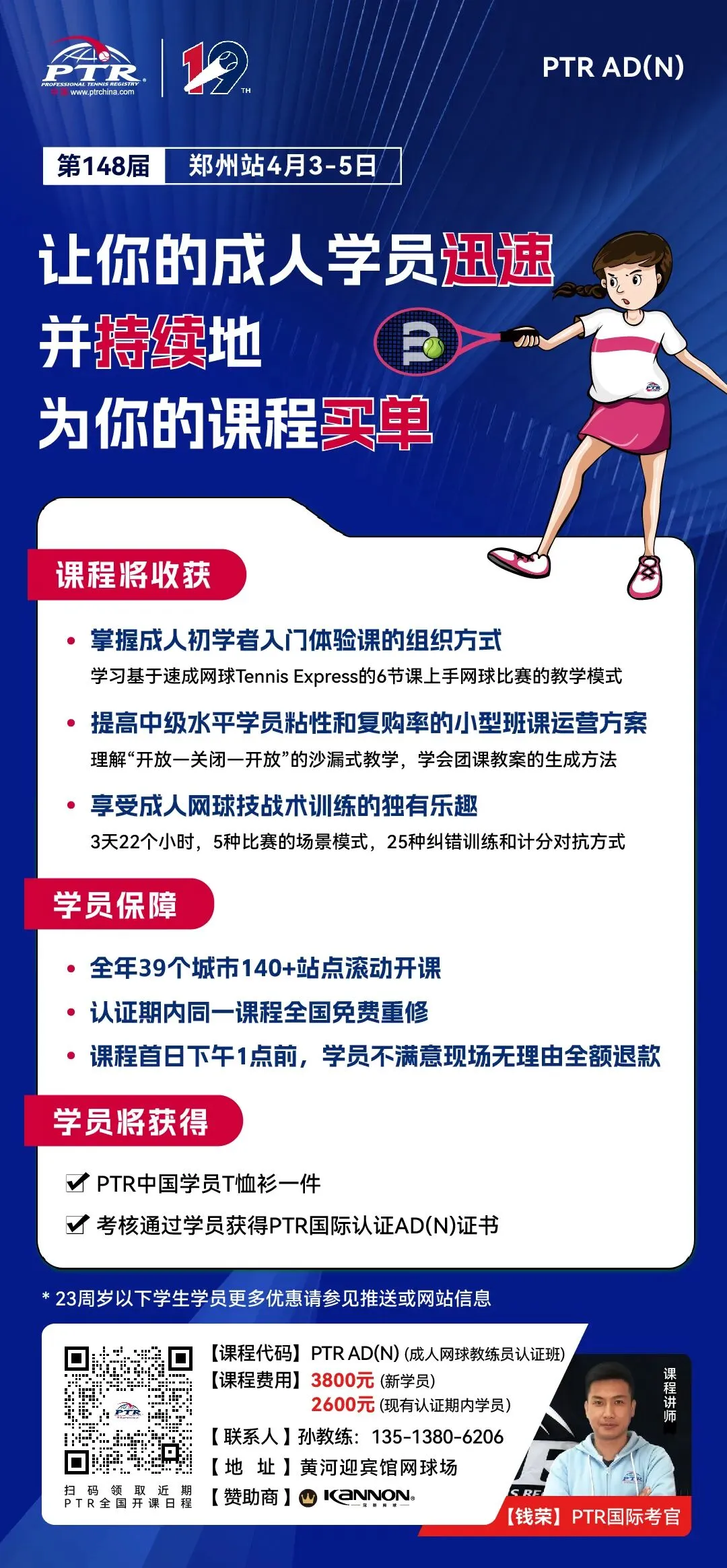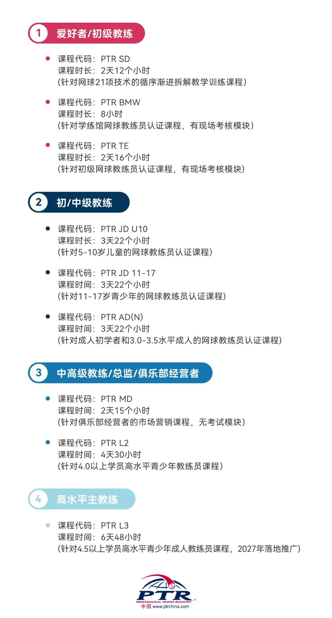 2026年4月3日-4月5日,【PTR中国】将与【英邦体育】合作,将 PTR AD(N)课程带到郑州,在三天时间内为郑州地区的广大网球教练员带来一场“让你的成人学员迅速并持续地为你的课程买单”的网球课程。期待大家的加入。