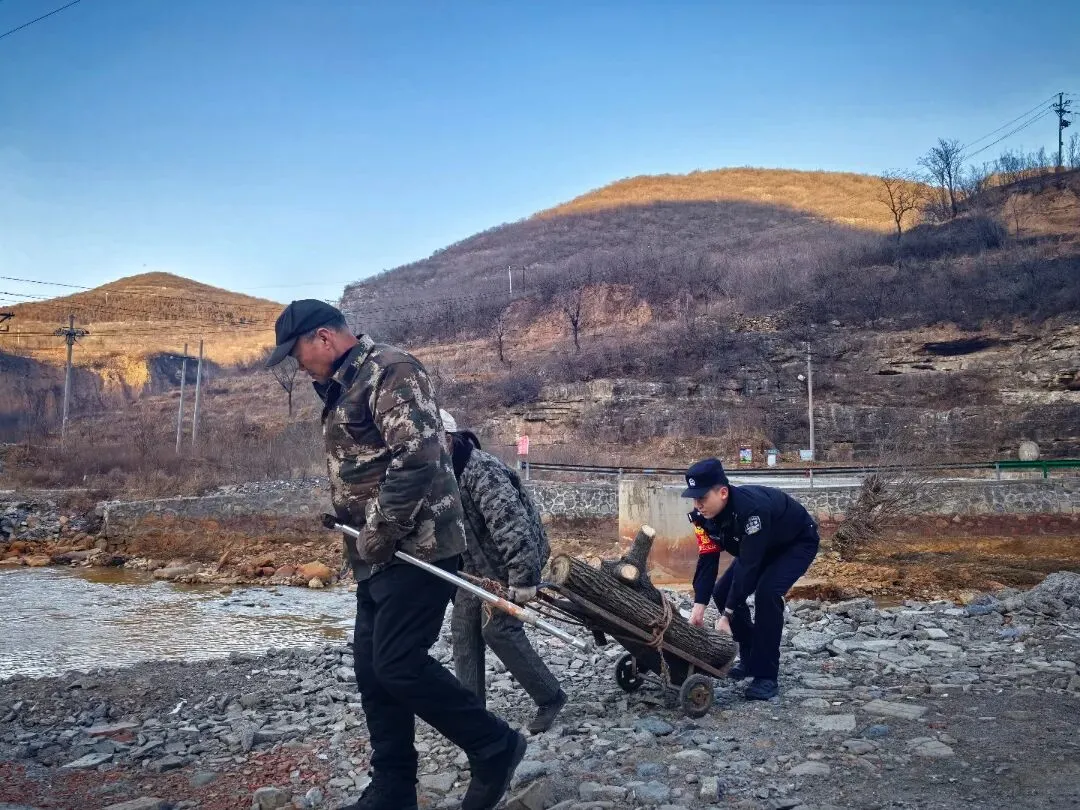 民警在铁路沿线开展日常巡逻时,途经一处河滩路段,发现两名群众正费力地推着满载木柴的手推车前行。由于路面碎石遍布、崎岖难行,手推车行进十分艰难。见此情景,民警立即上前,主动帮助群众推送手推车,顺利通过了这段难行路段。
