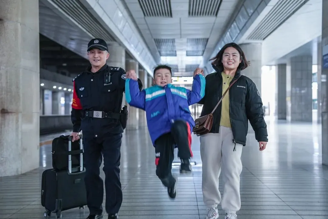 除夕当天,郑州铁路公安处乘警张子建结束值乘工作返程到站,妻子与儿子专程来到站台等候迎接。一家三口手牵手温馨相伴,并肩走向出站口,在坚守与团圆中共度意义非凡的除夕,定格铁路公安舍小家为大家的温情瞬间。