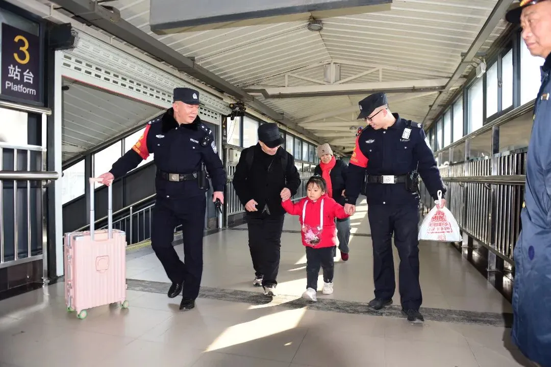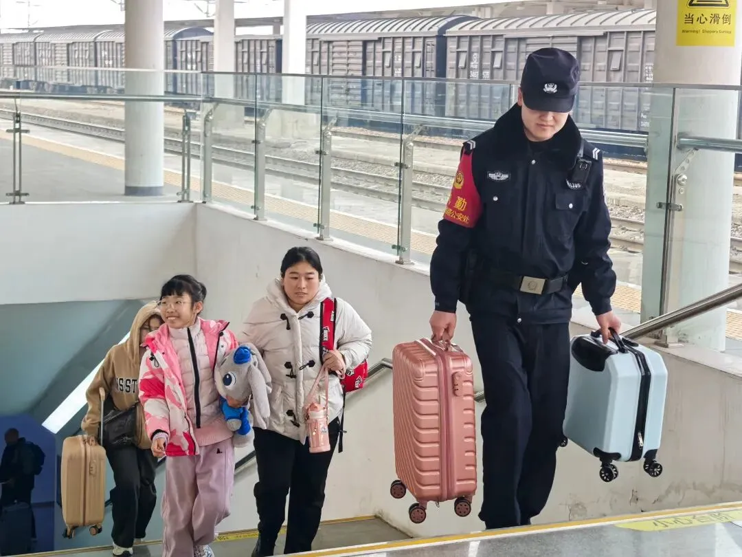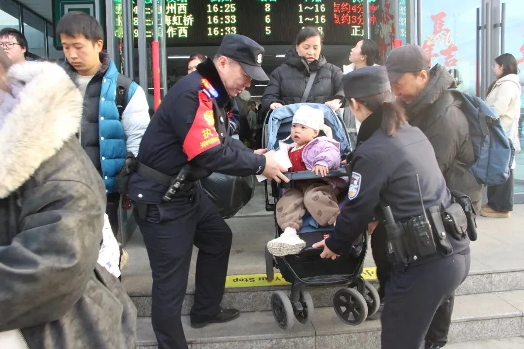 春节归途,出站口熙熙攘攘。两名执勤民警正在为手推婴儿车的旅客完成一次温暖的“台阶接力”,这是援手、是护航、更是安心。