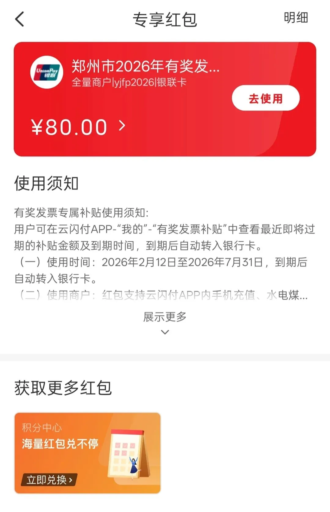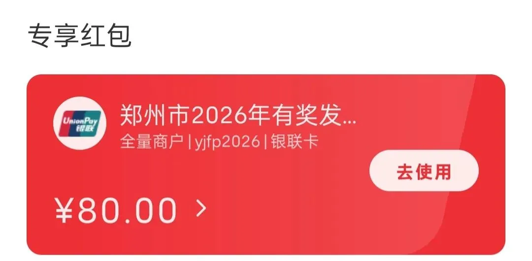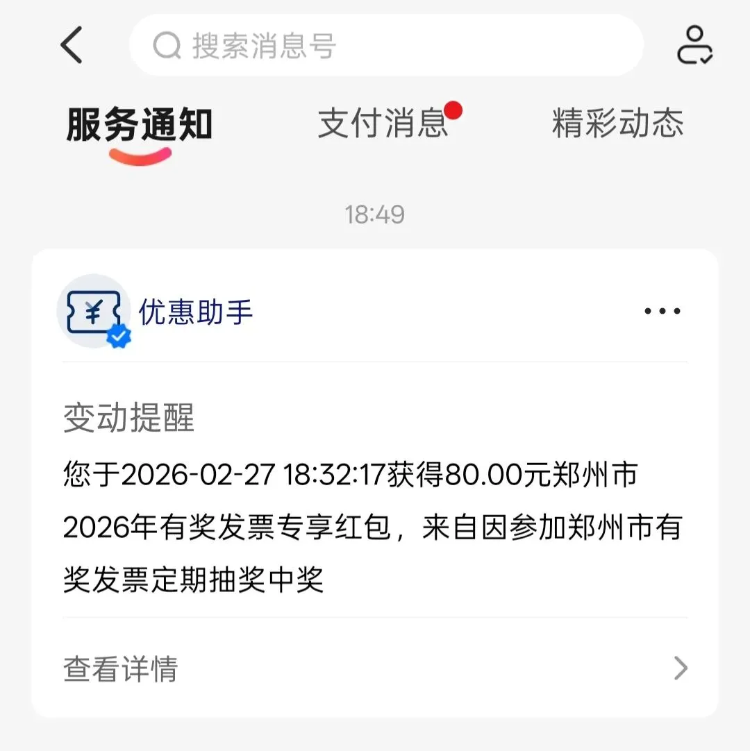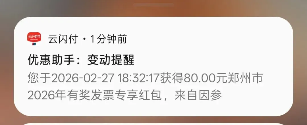 就在刚刚地铁扫码进站的时候,手机突然震动了一下。原本以为是群消息,结果点开一看,竟然是【优惠助手】发来的通知:您于2026年2月27日18:32:17获得80.00元郑州市2026年有奖发票专享红包!