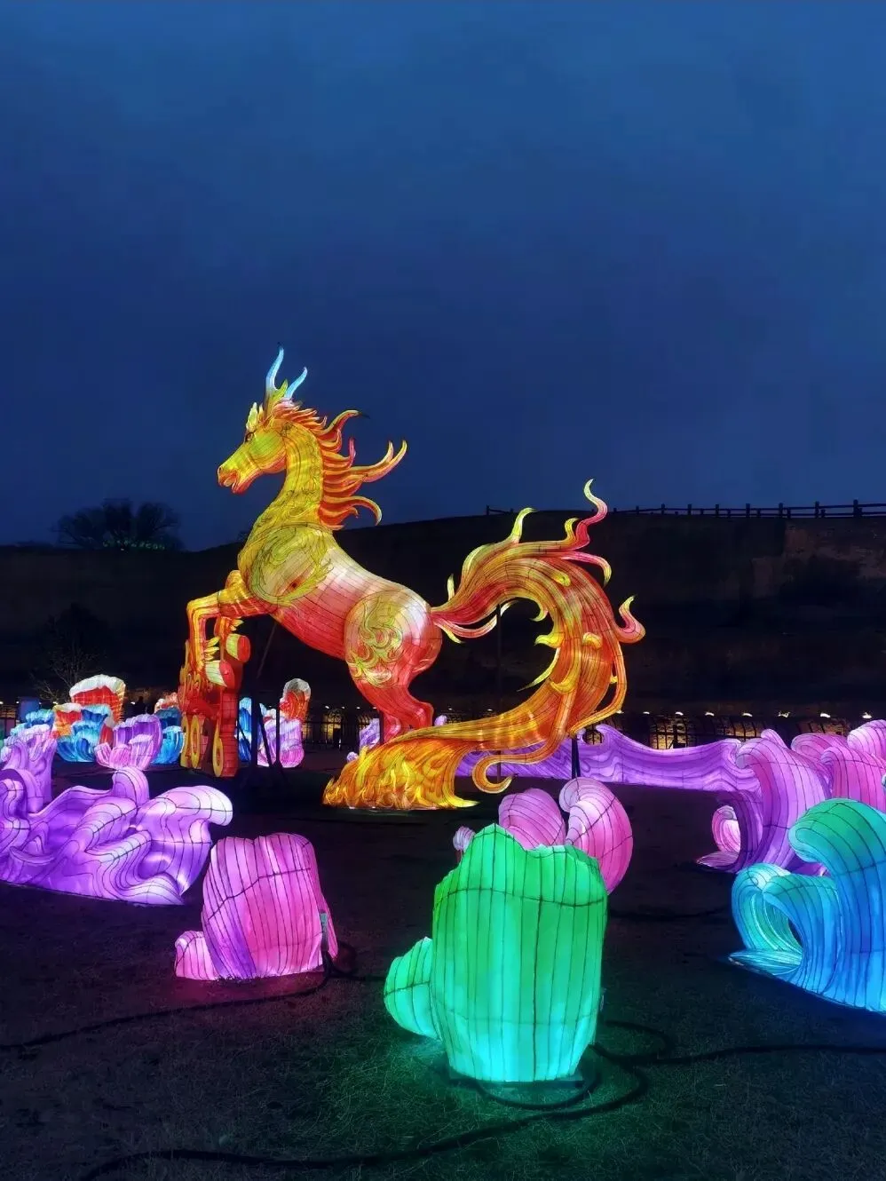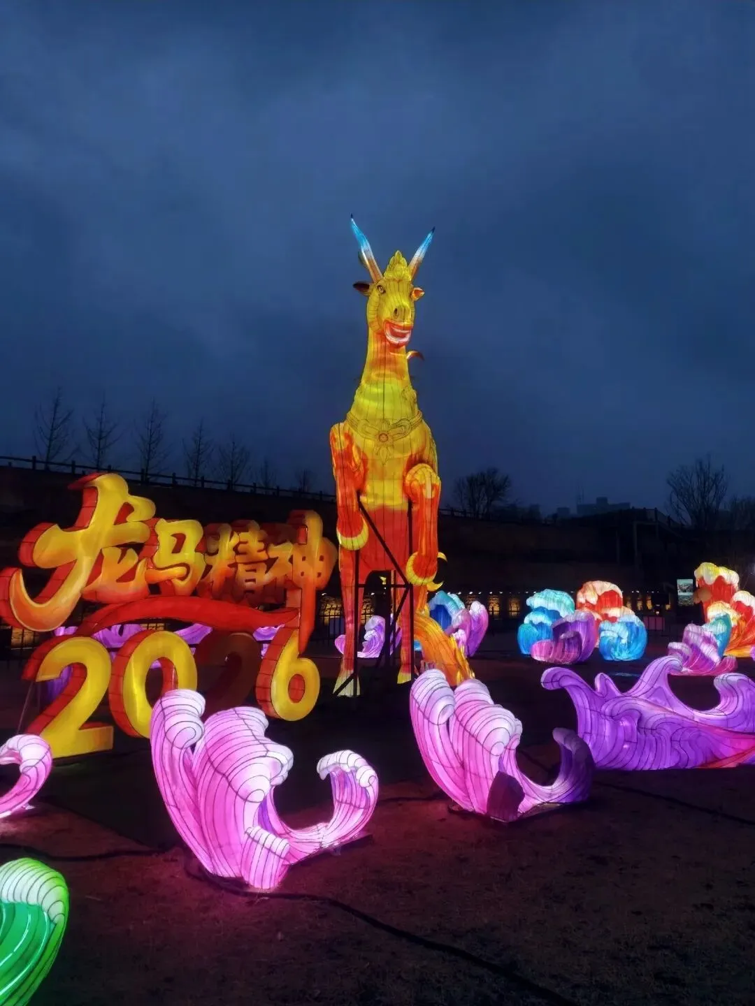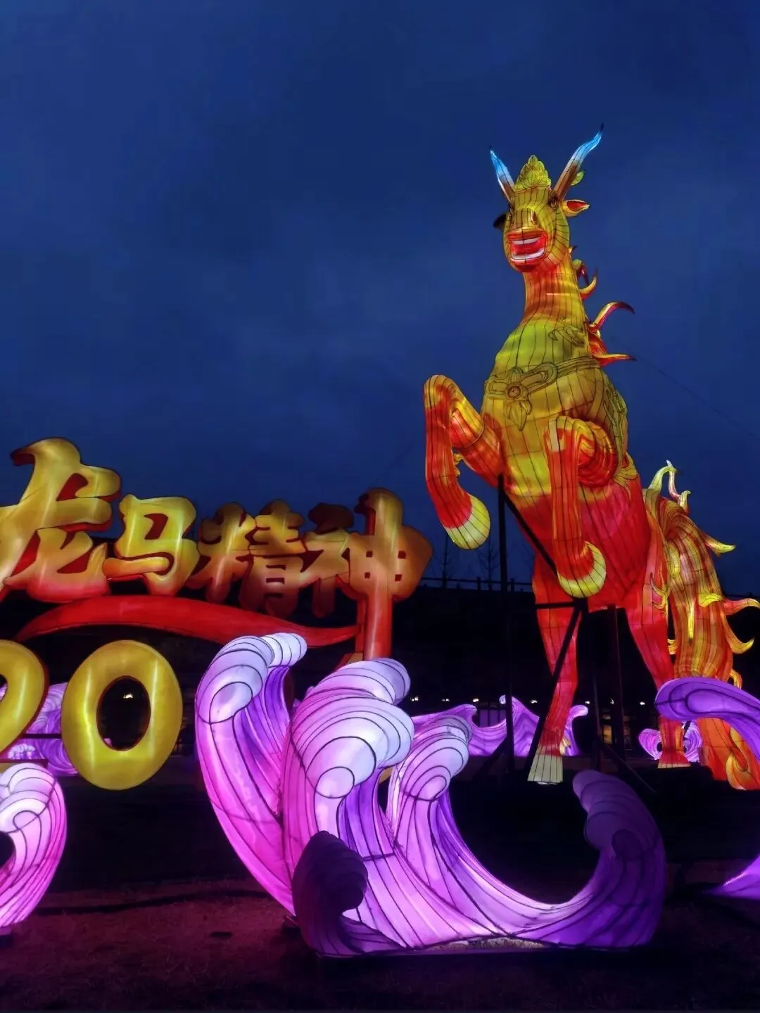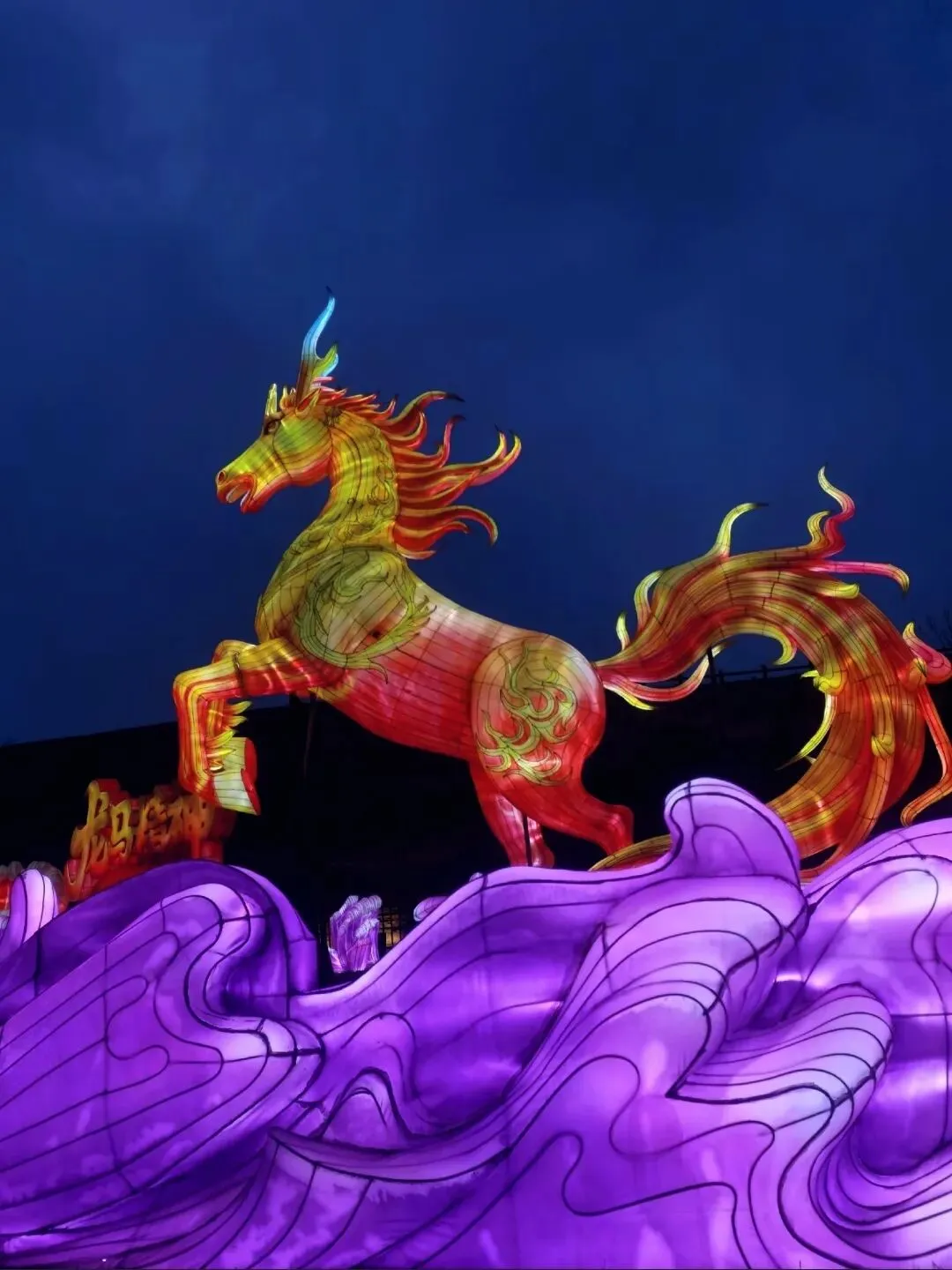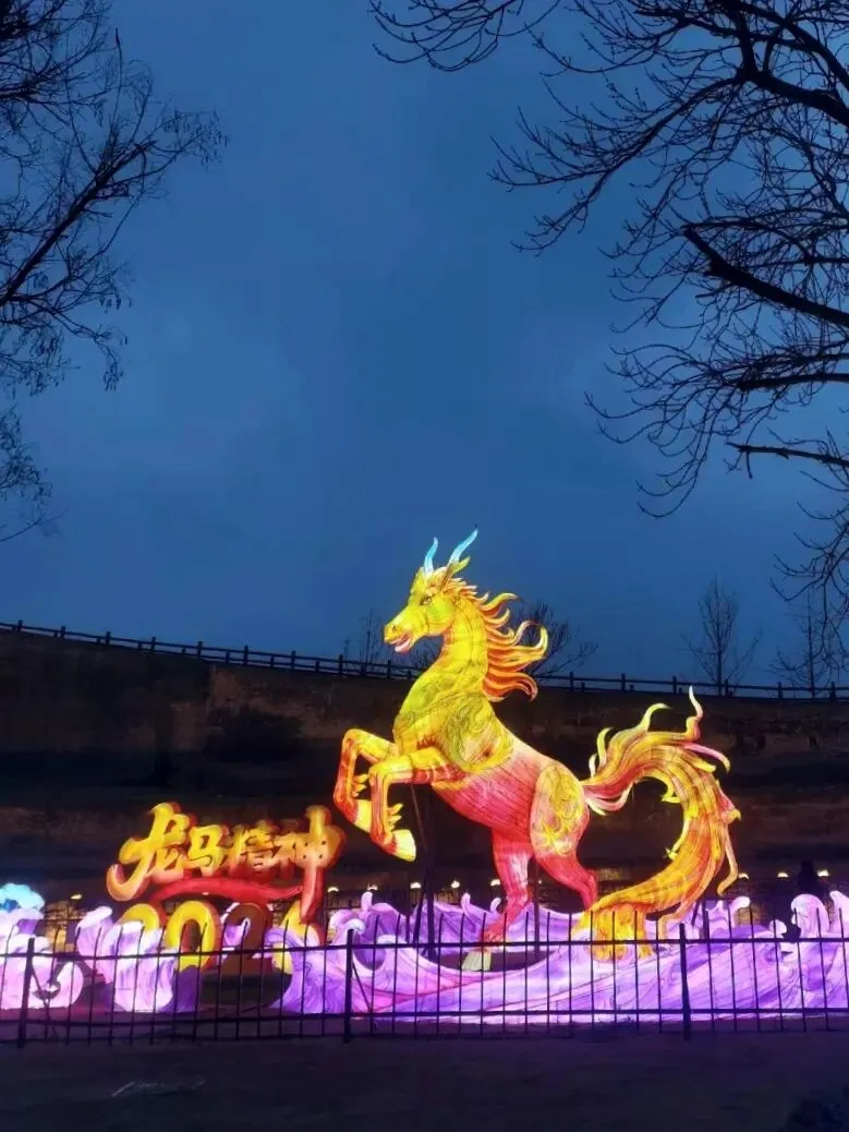穿过地平门南顺城街,一组组以“马”为元素的灯组便撞入眼帘。五匹形态各异的骏马灯组错落分布,有的昂首嘶鸣,鬃毛似被风扬起,在暖黄灯光下仿佛下一秒就要踏碎夜色奔腾而出;有的低头饮水,神态灵动可爱,引得孩童们欢呼雀跃。这些灯组巧妙融合了甲骨文“马”字的象形特征与现代光影技术,既彰显了马年“龙马精神”的昂扬气韵,又暗合了郑州作为商都的历史底蕴。我驻足于一匹“剪纸风”骏马前,红彤彤的灯影透过镂空的纹路,在地面投下斑驳的光影,恍惚间竟似穿越回商周时期的祭祀场景,耳边仿佛响起青铜器碰撞的清越之声。