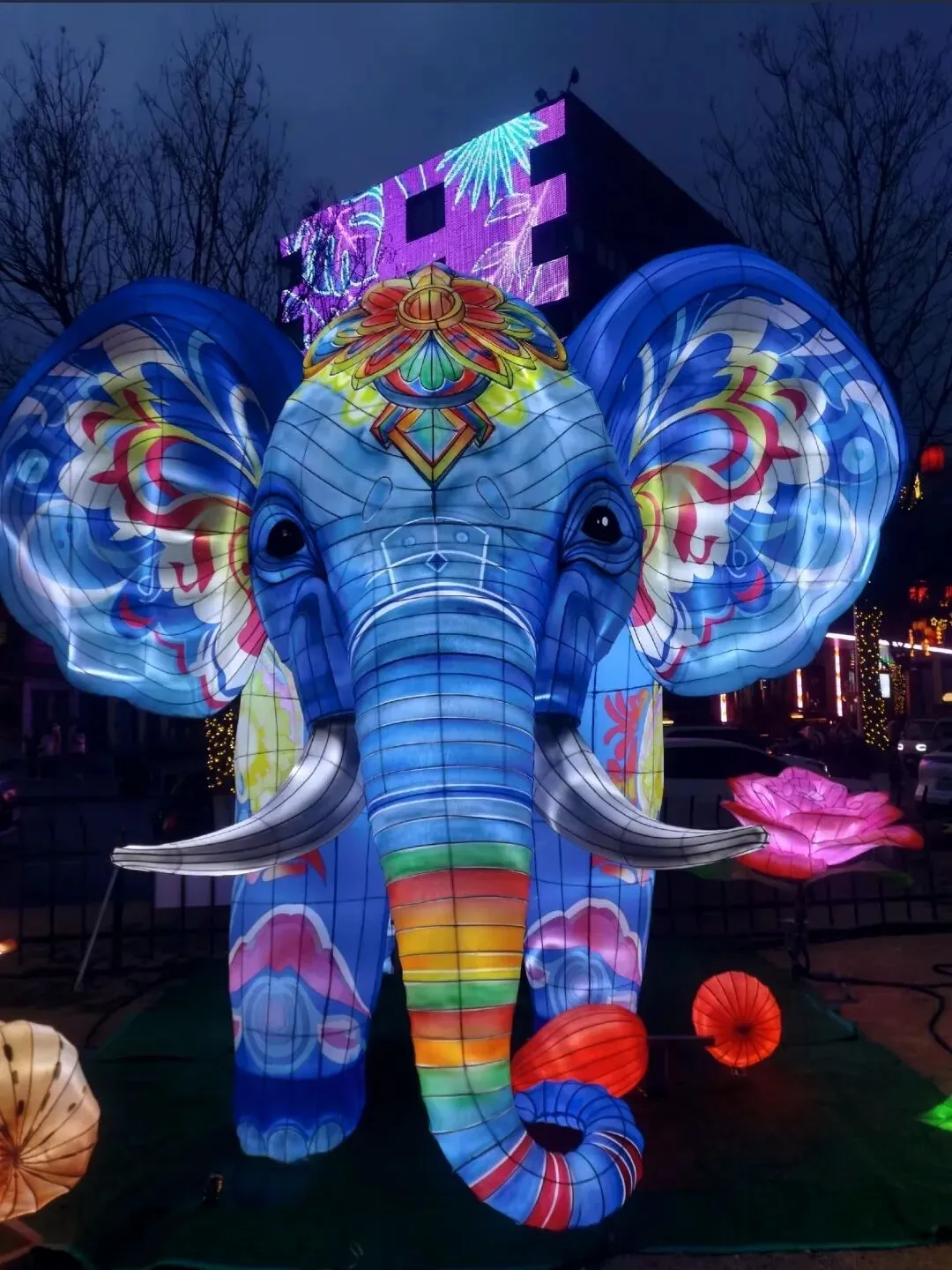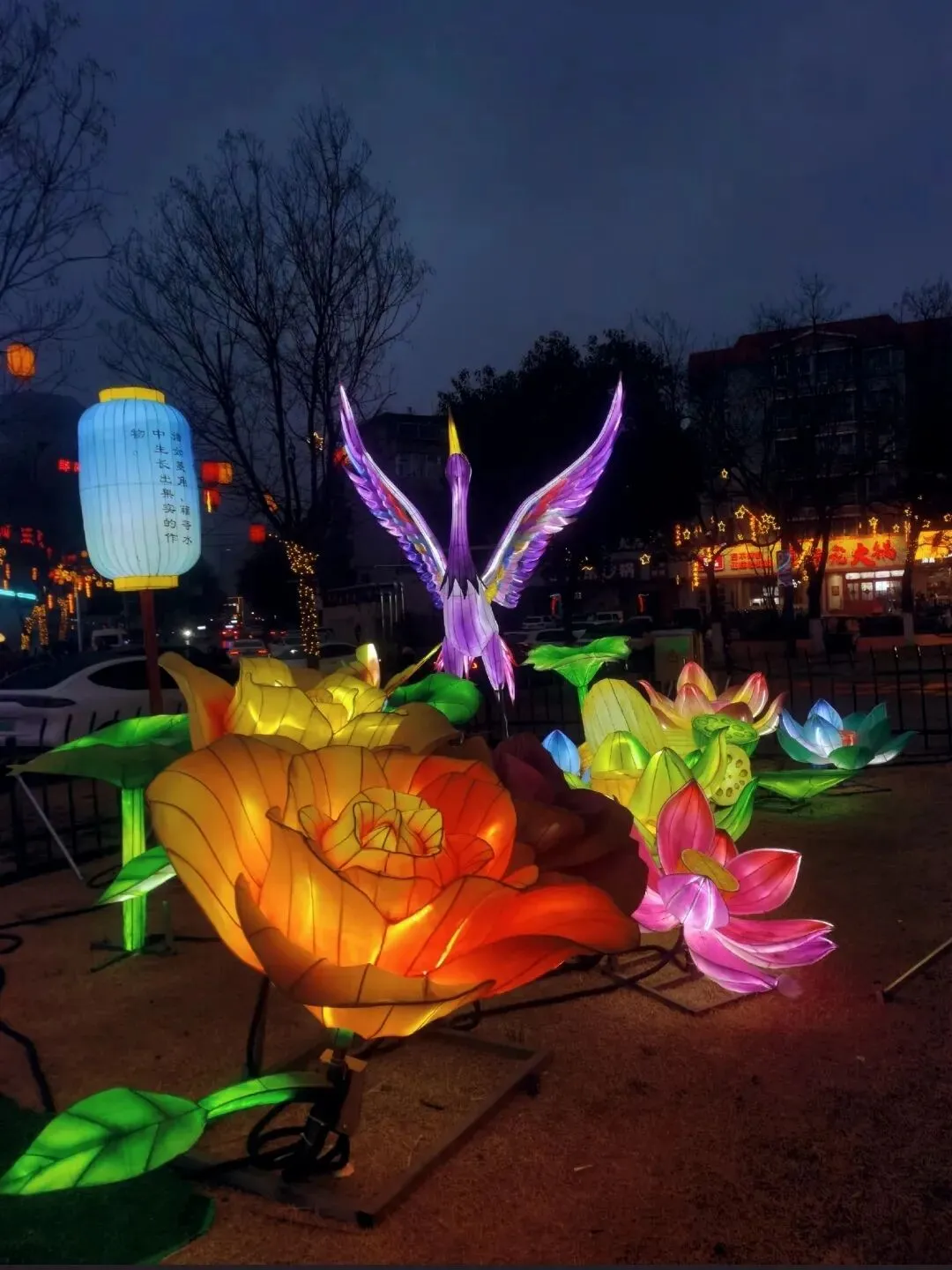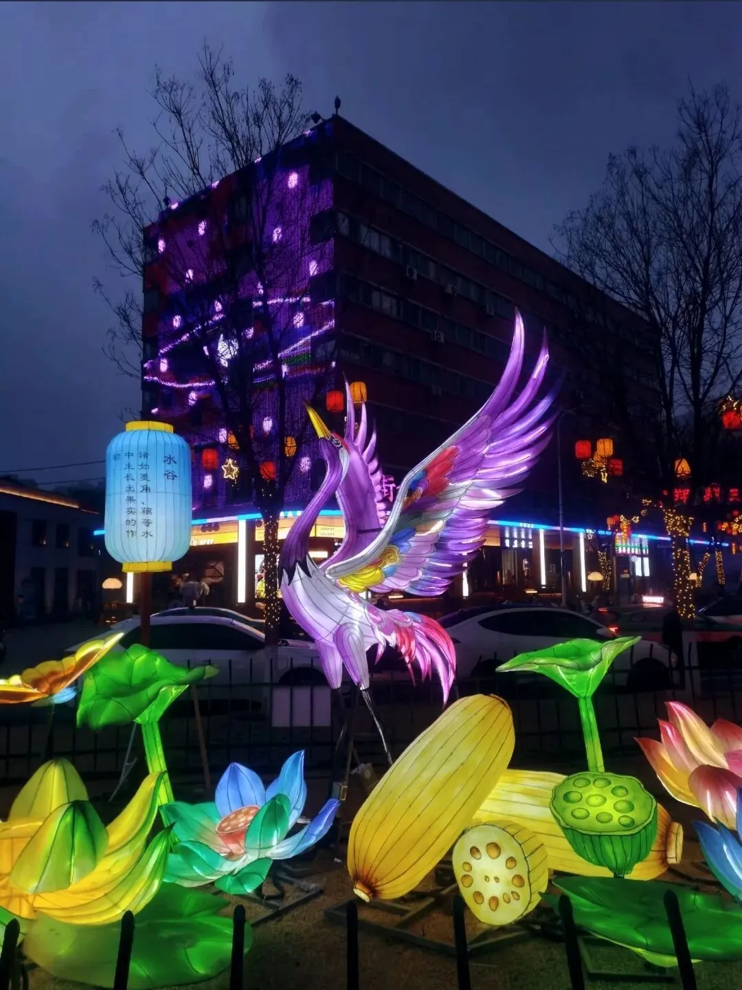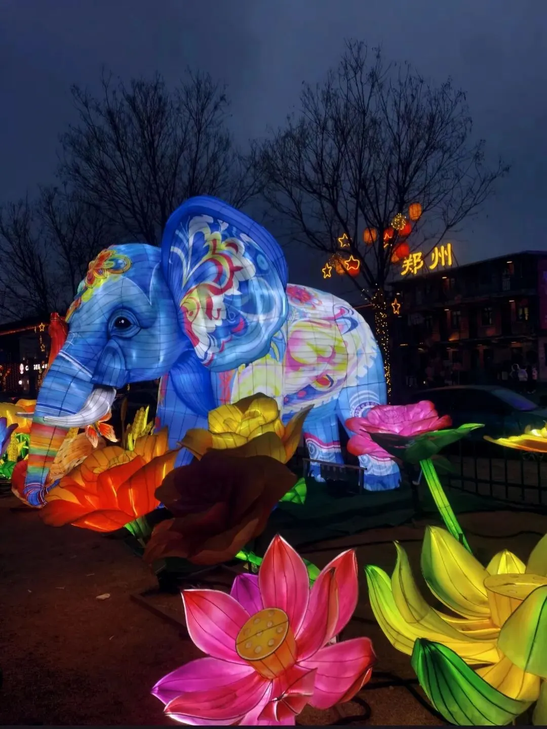 穿过地平门南顺城街,一组组以“马”为元素的灯组便撞入眼帘。五匹形态各异的骏马灯组错落分布,有的昂首嘶鸣,鬃毛似被风扬起,在暖黄灯光下仿佛下一秒就要踏碎夜色奔腾而出;有的低头饮水,神态灵动可爱,引得孩童们欢呼雀跃。这些灯组巧妙融合了甲骨文“马”字的象形特征与现代光影技术,既彰显了马年“龙马精神”的昂扬气韵,又暗合了郑州作为商都的历史底蕴。我驻足于一匹“剪纸风”骏马前,红彤彤的灯影透过镂空的纹路,在地面投下斑驳的光影,恍惚间竟似穿越回商周时期的祭祀场景,耳边仿佛响起青铜器碰撞的清越之声。