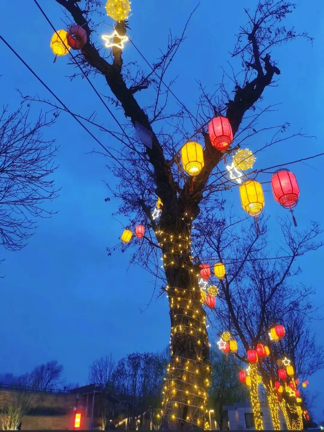 转入里仁广场,氛围灯组层层铺展,将街区的热闹与温馨浸透到每一条街巷。梧桐树广场上,百年梧桐的枝桠间缀满灯串,流光溢彩如繁星垂落,树下三三两两的游人或拍照留念,或轻声交谈,脸上洋溢着满足的笑容。我抬头仰望,灯光与夜空交相辉映,古老的城墙在光影中若隐若现,仿佛一位沉默的长者,见证着这座城市的过去与现在,也守护着此刻的烟火人间。