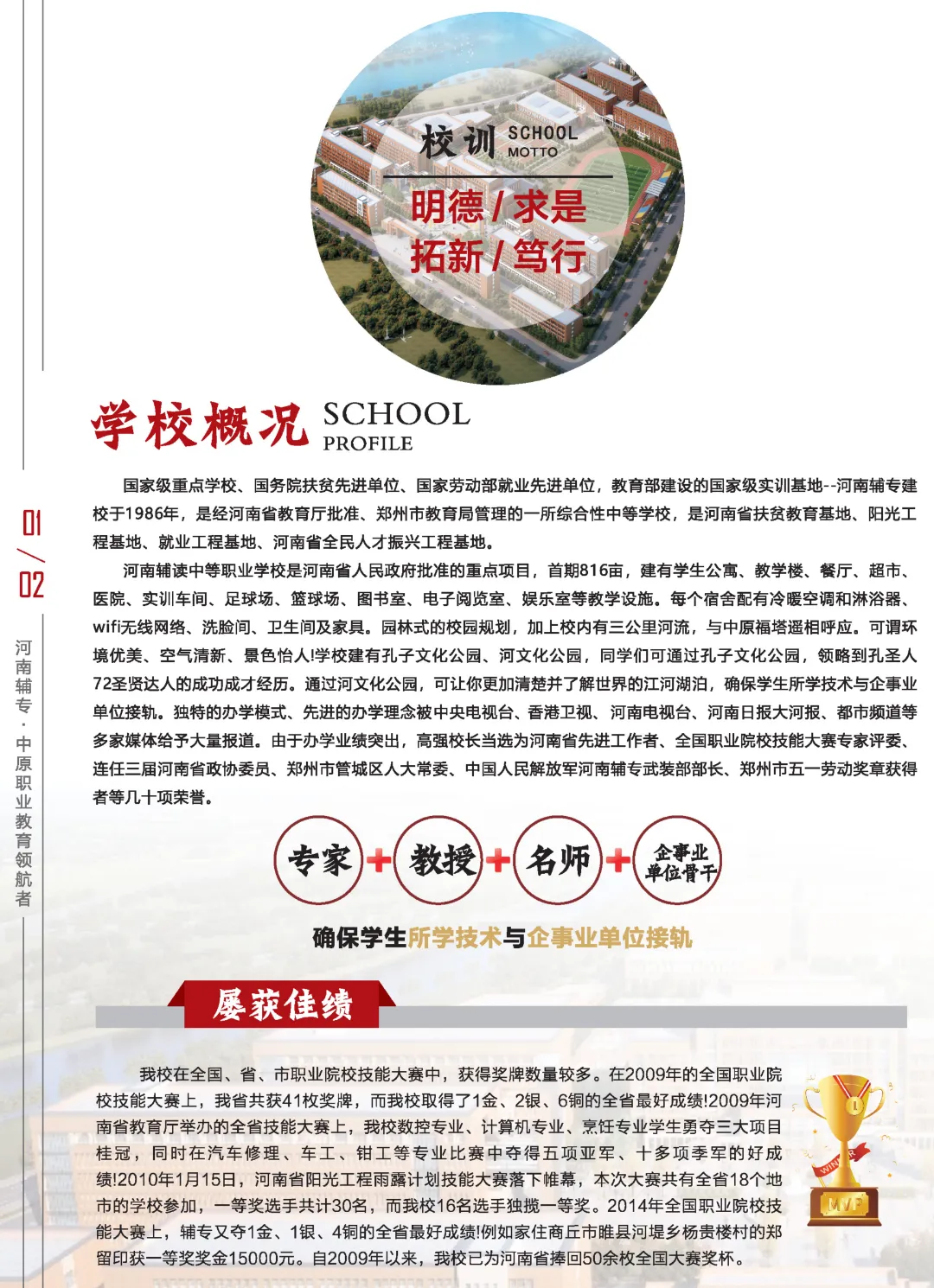 河南辅读中等职业学校(河南辅专),招生代码:186,创建于1986年,是国家级重点学校、国务院扶贫先进单位、国家劳动部就业先进单位,教育部建设的国家级实训基地--是经河南省教育厅批准、郑州市教育局管理的一所综合性中等学校,是河南省扶贫教育基地、阳光工程基地、就业工程基地、河南省全民人才振兴工程基地。