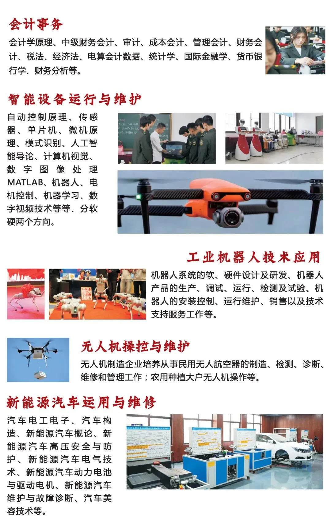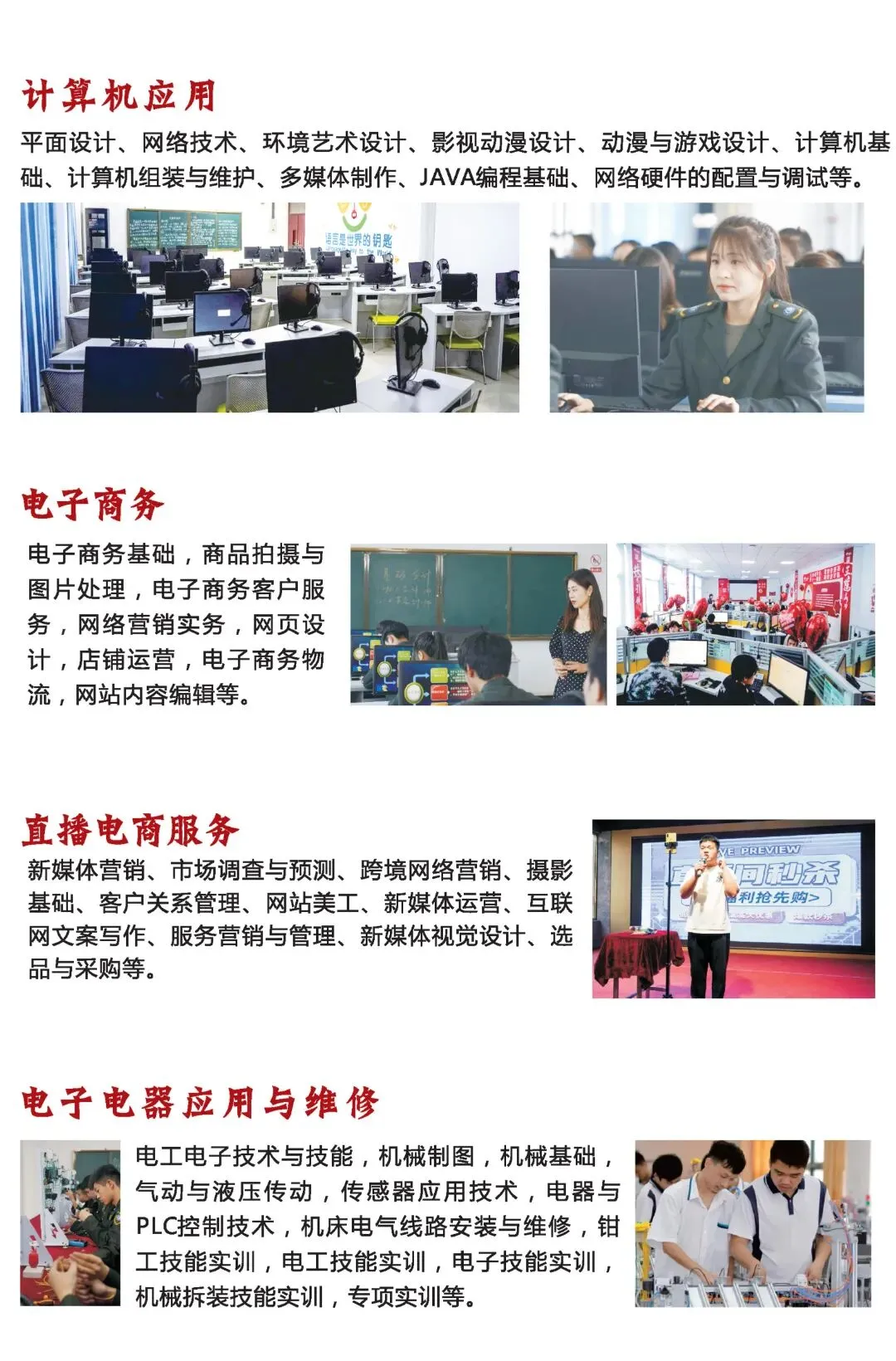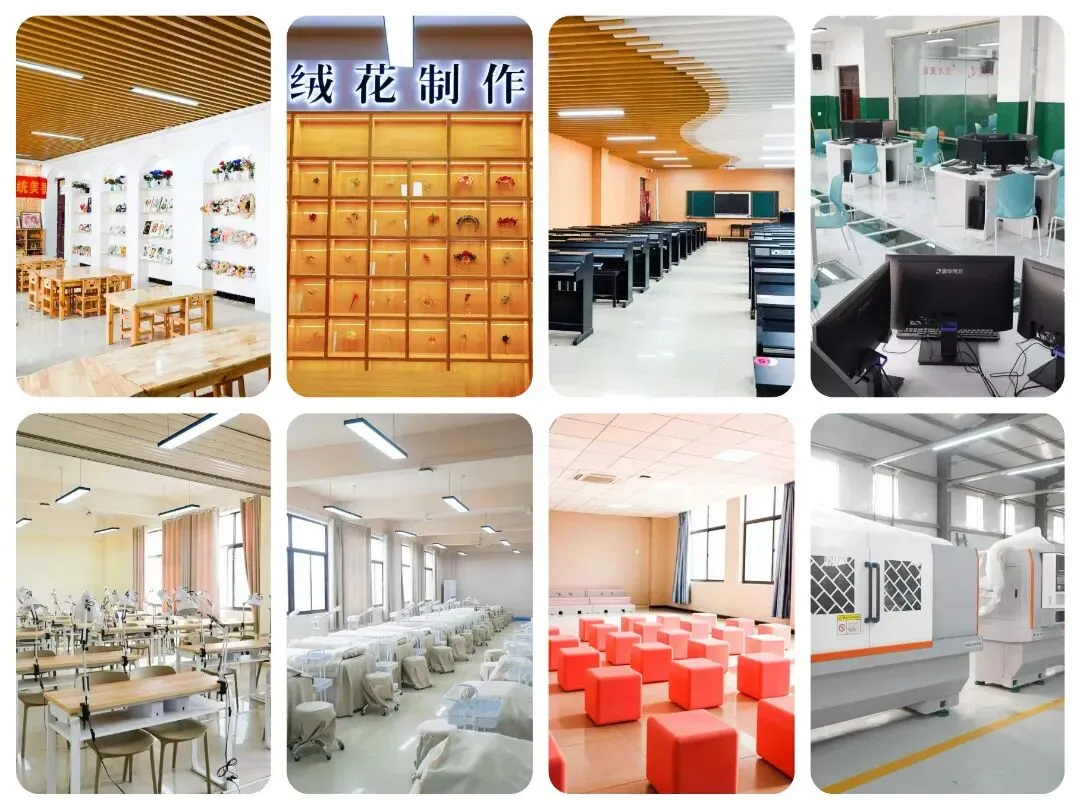 近期新增网络搭建平台实训室、计算机组装与维修实训室、电子工艺实训室、传感器实训室、PLC实训室、液压气动实训室、无人机组装与飞行实训室、声乐实训室、手工素养实训室、非遗绒花展馆、跨境电商实训平台、网店运营基础实训平台等。