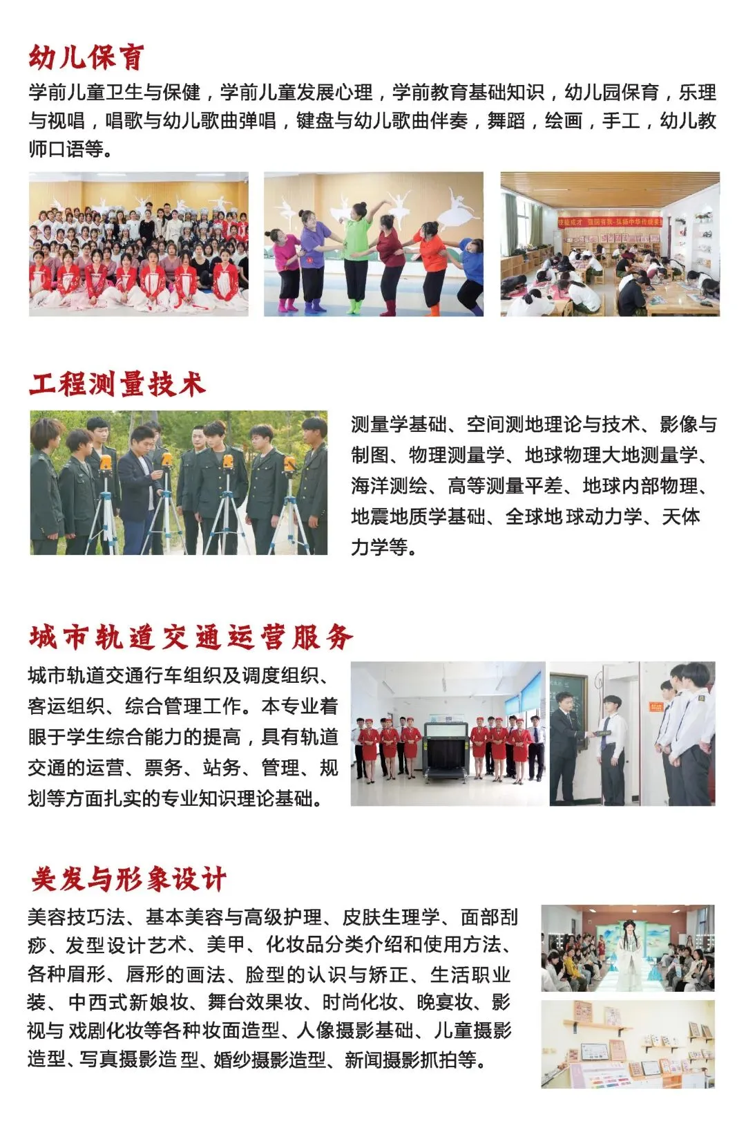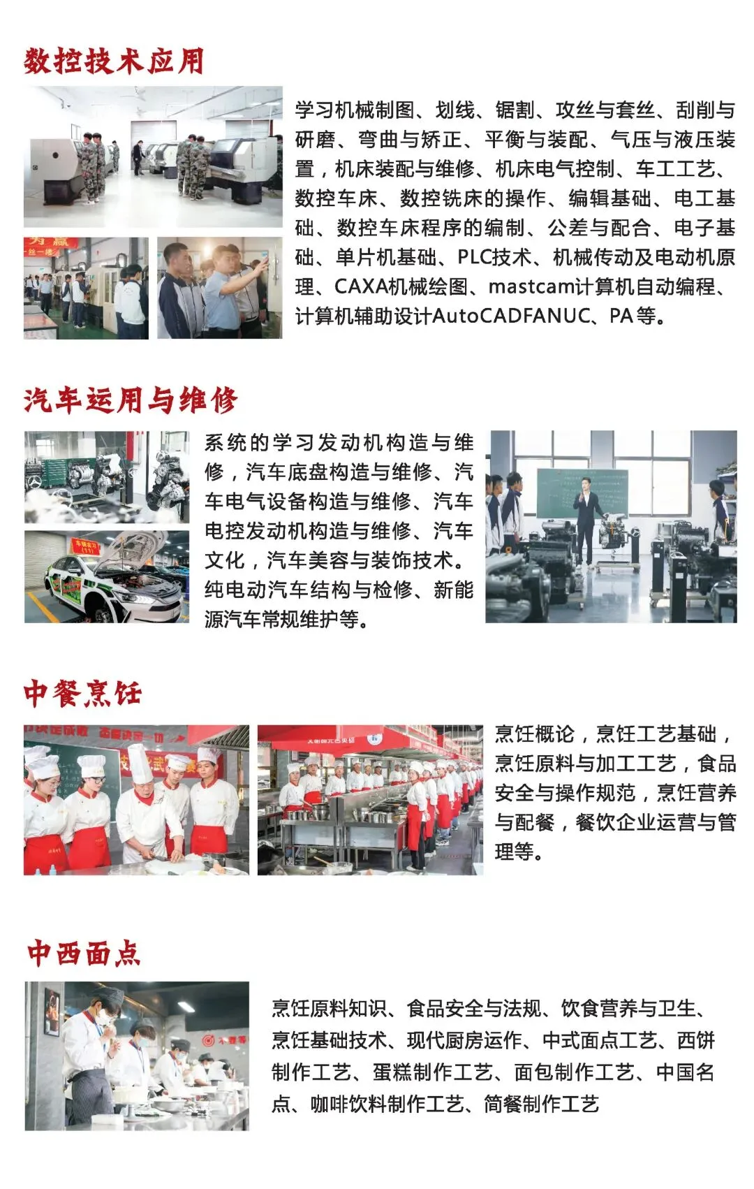主要实训室有:京东电子商务客户服务实训室(校企共建)、高级轿车整车实训中心、新能源汽修实训中心、烹饪教学实训室、形体礼仪实训室、钢琴室、美容美体实训室、摄影实训室、城轨沙盘实训室、智能设备实训室、多功能语音室、直播电商实训室等。