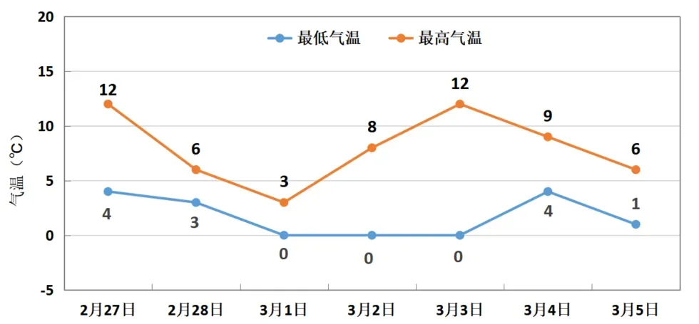 2月28日夜里至3月1日偏北风3到4级,阵风6级左右。3月1日最高气温较前期下降8~9℃。