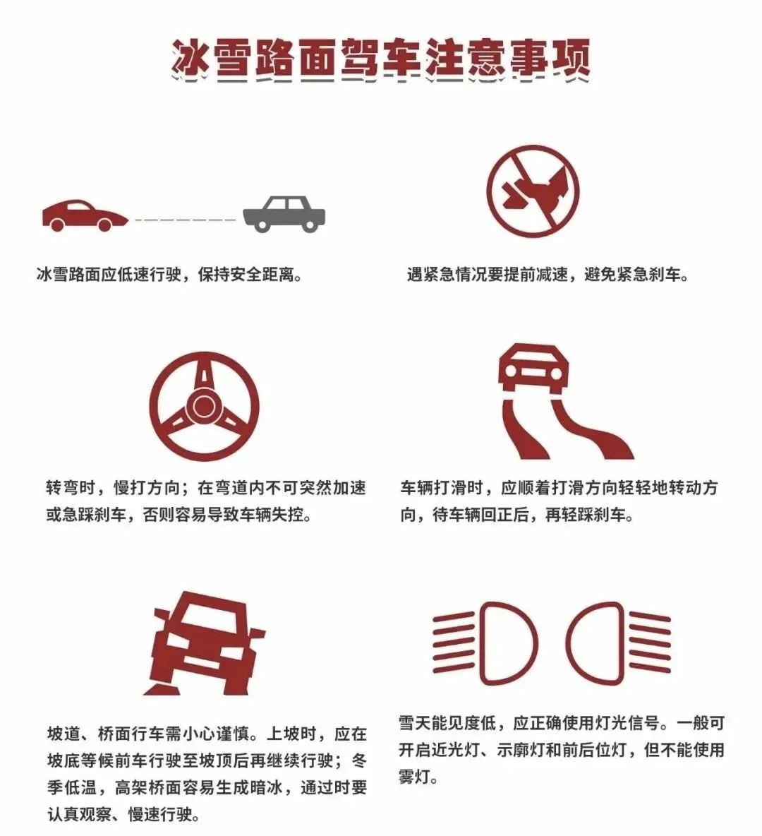上车后先转动方向盘,确认转向系统能否正常工作;检查轮胎是否在正常状态下;检查灯光、雨刮器是否正常工作;在车辆起步后轻踩刹车,确认刹车系统有没有被积雪冻住或者其他故障。