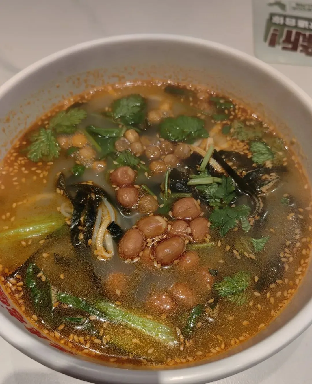 汤也很浓郁,里面加了花生和豌豆,嚼着嘎嘣脆,撒了我最爱吃的香菜,还有芝麻。