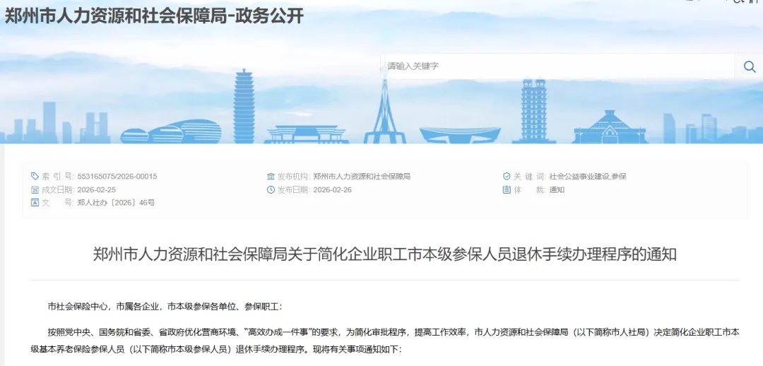 郑州市人力资源和社会保障局关于简化企业职工市本级参保人员退休手续办理程序的通知