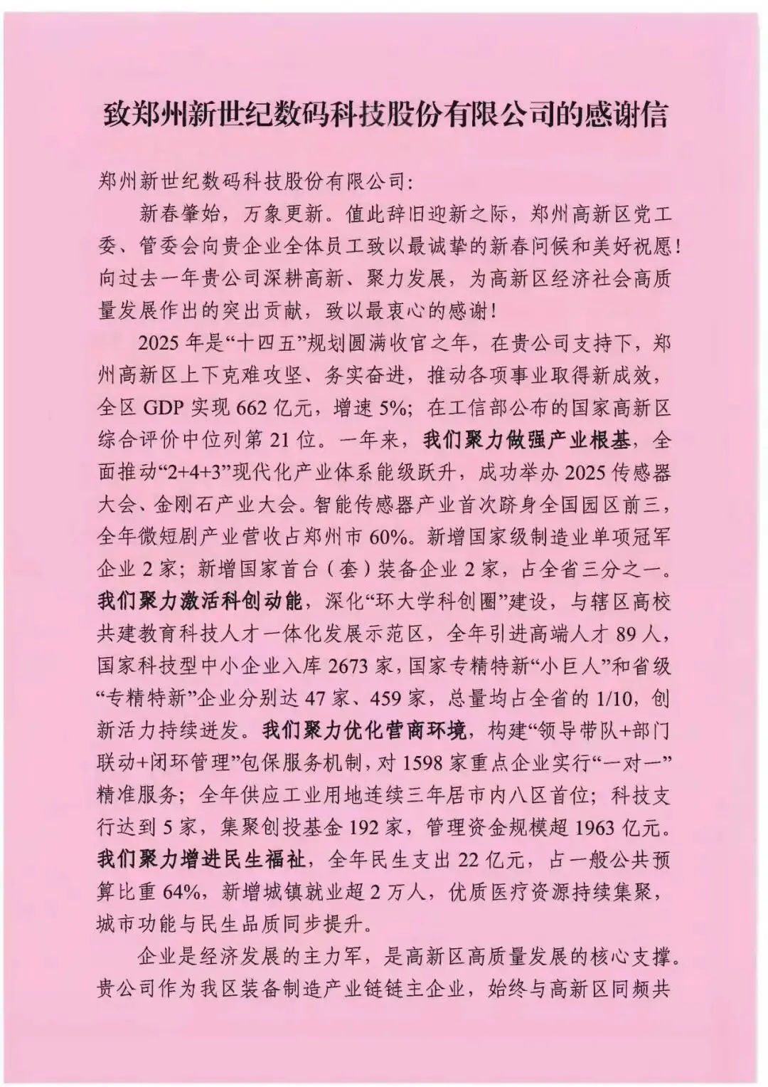 近日,郑州市人民政府正式印发《关于表扬2025年郑州市实体经济高质量发展专项工作表现突出企业的通报》,对全市在实体经济领域深耕细作、成效显著的企业予以通报表扬。郑州新世纪数码科技股份有限公司(以下简称“郑州新世纪”)凭借在高端装备制造领域的创新突破、稳健经营的扎实成效以及对地方经济发展的积极贡献,成功入选榜单,用实干与坚守斩获市级荣誉肯定,彰显了新时代实体企业的责任与担当。