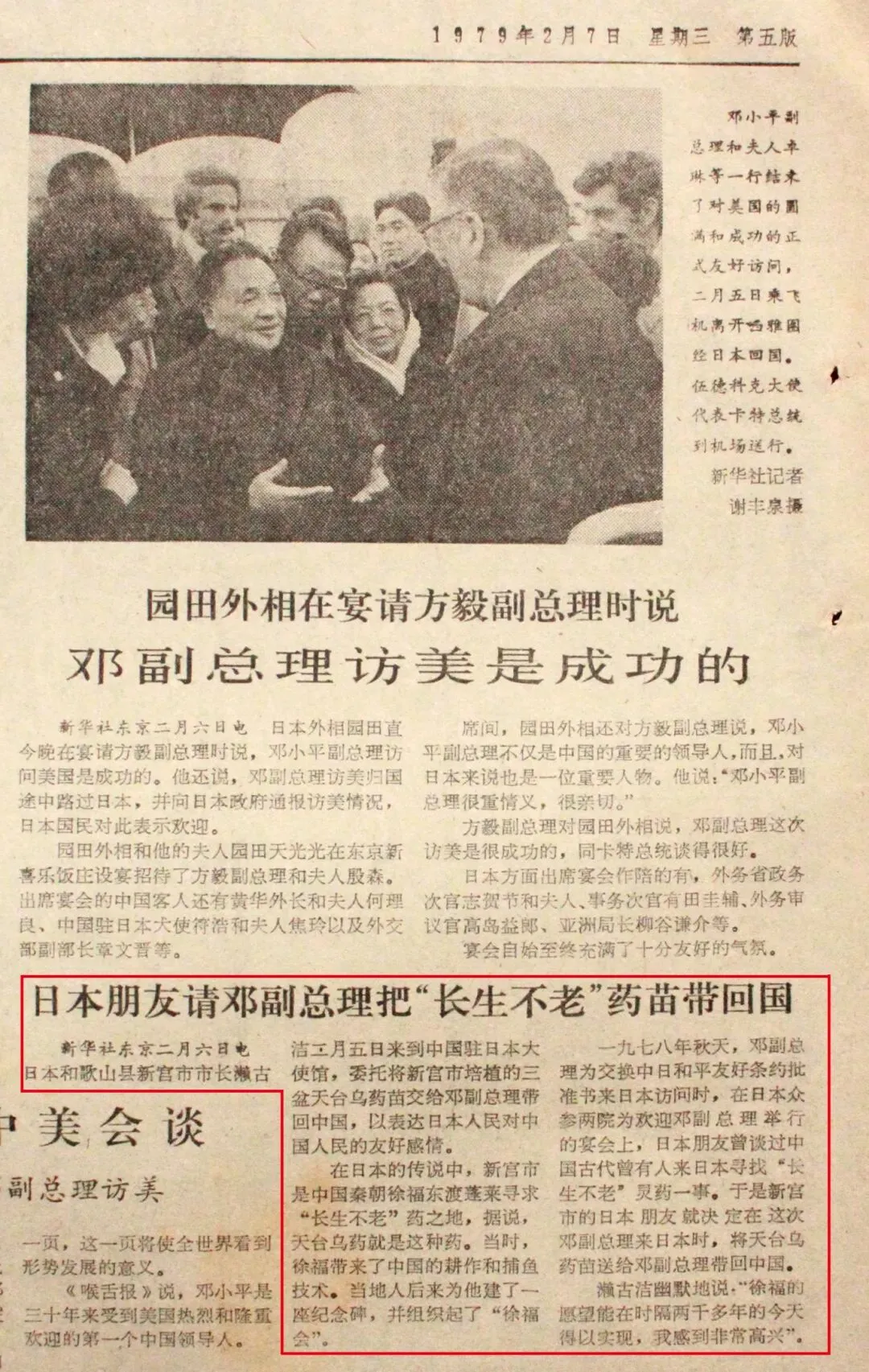 一九七九年二月邓小平访美归国途径日本,日本新宫市市长灏古洁将三盆天台乌药苗交给邓副总理带回中国。据说「长生不老药」就是二千多年前徐福找到的天台乌药。《人民日报》有题为《日本朋友请邓副总理把「长生不老」药苗带回国》的报道。