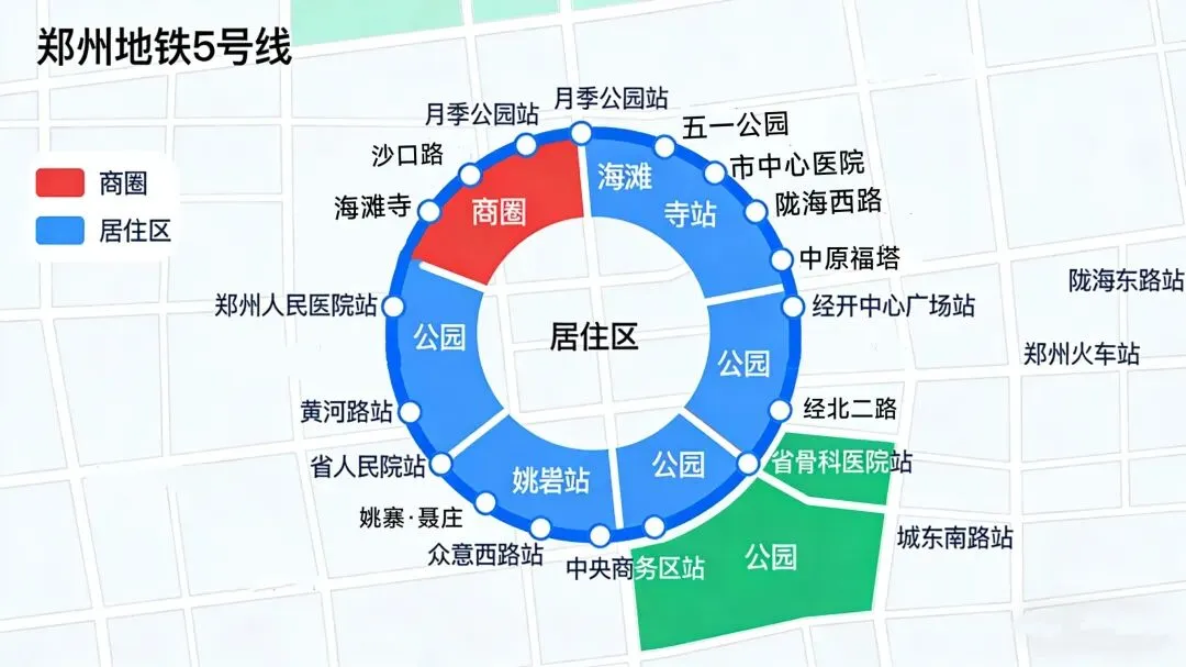 5号线作为郑州唯一的环线地铁,是风水里的“玉带环腰”,绕主城一周,串联月季公园、齐礼阎等站点,这些站点客流常年平稳且旺盛。