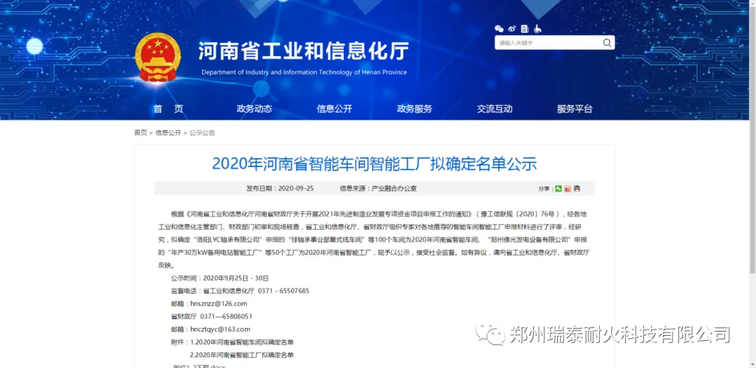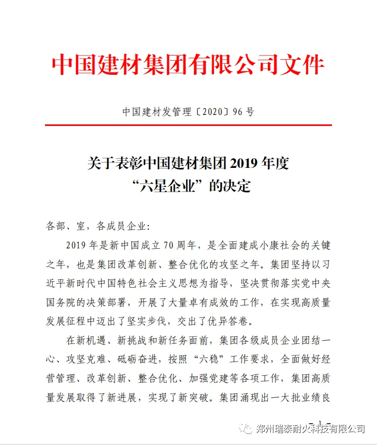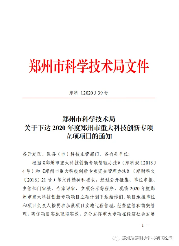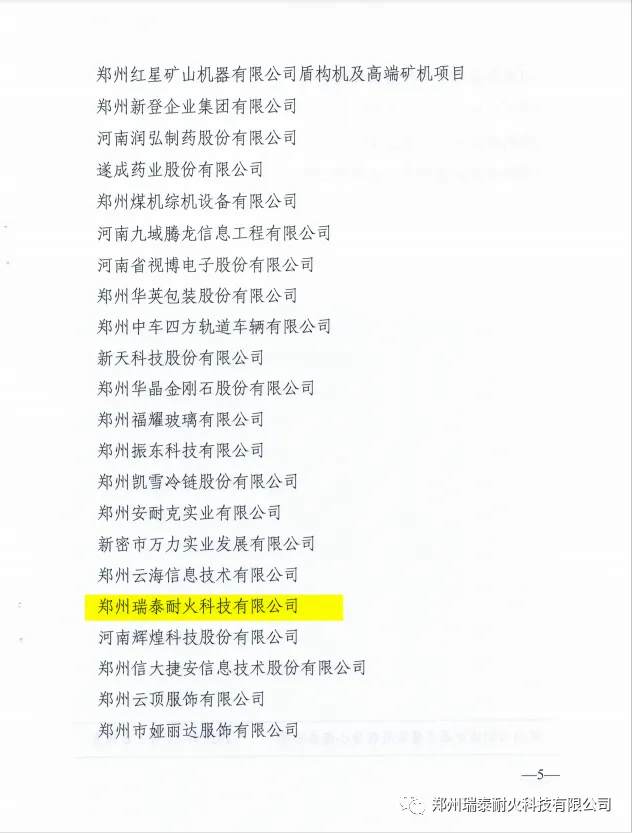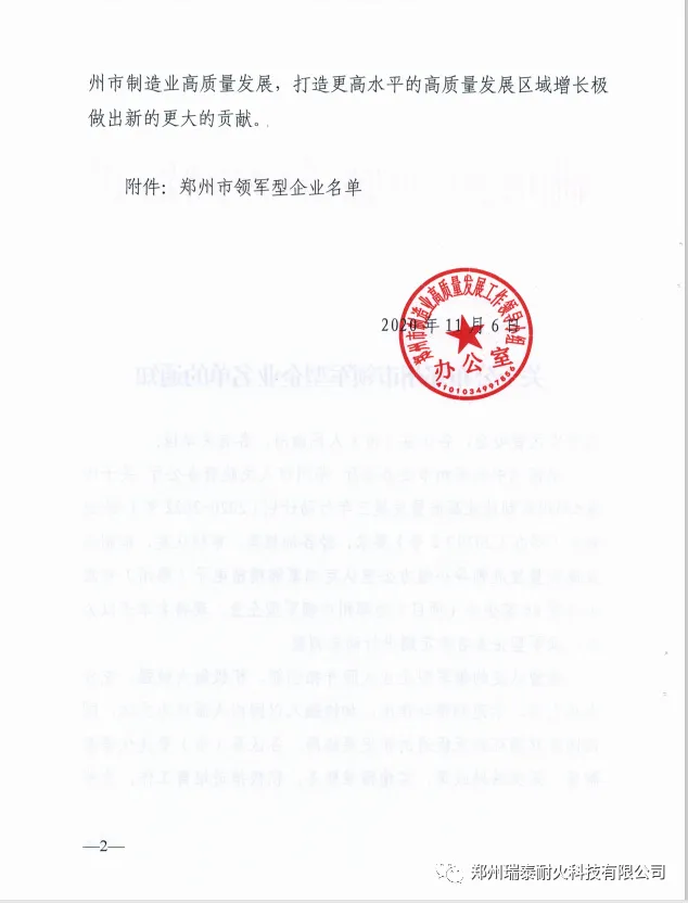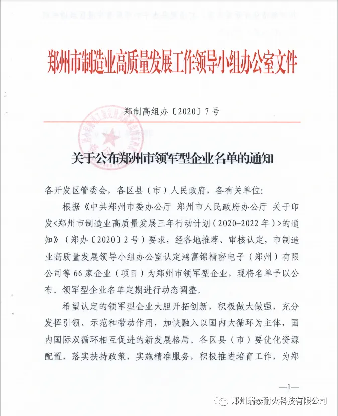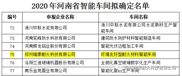 2020年,郑州瑞泰被评选为郑州市领军型企业,环境友好型耐火材料智能制造车间被评选为河南省省级智能车间。