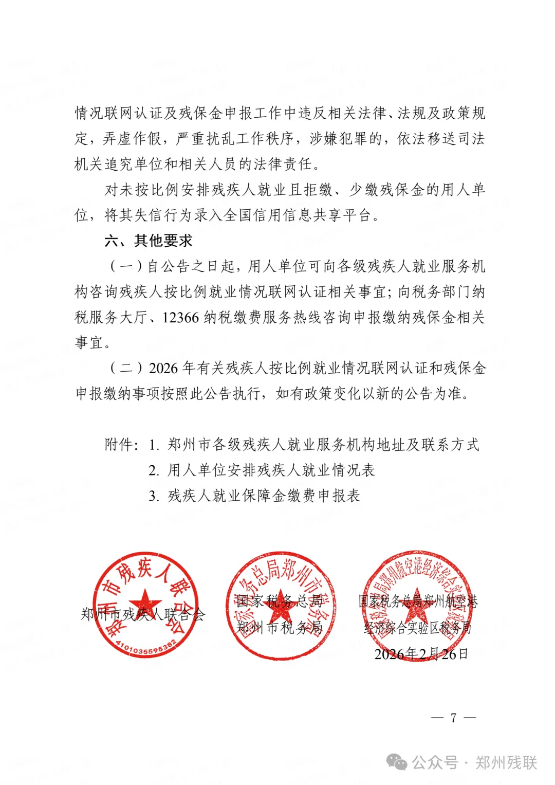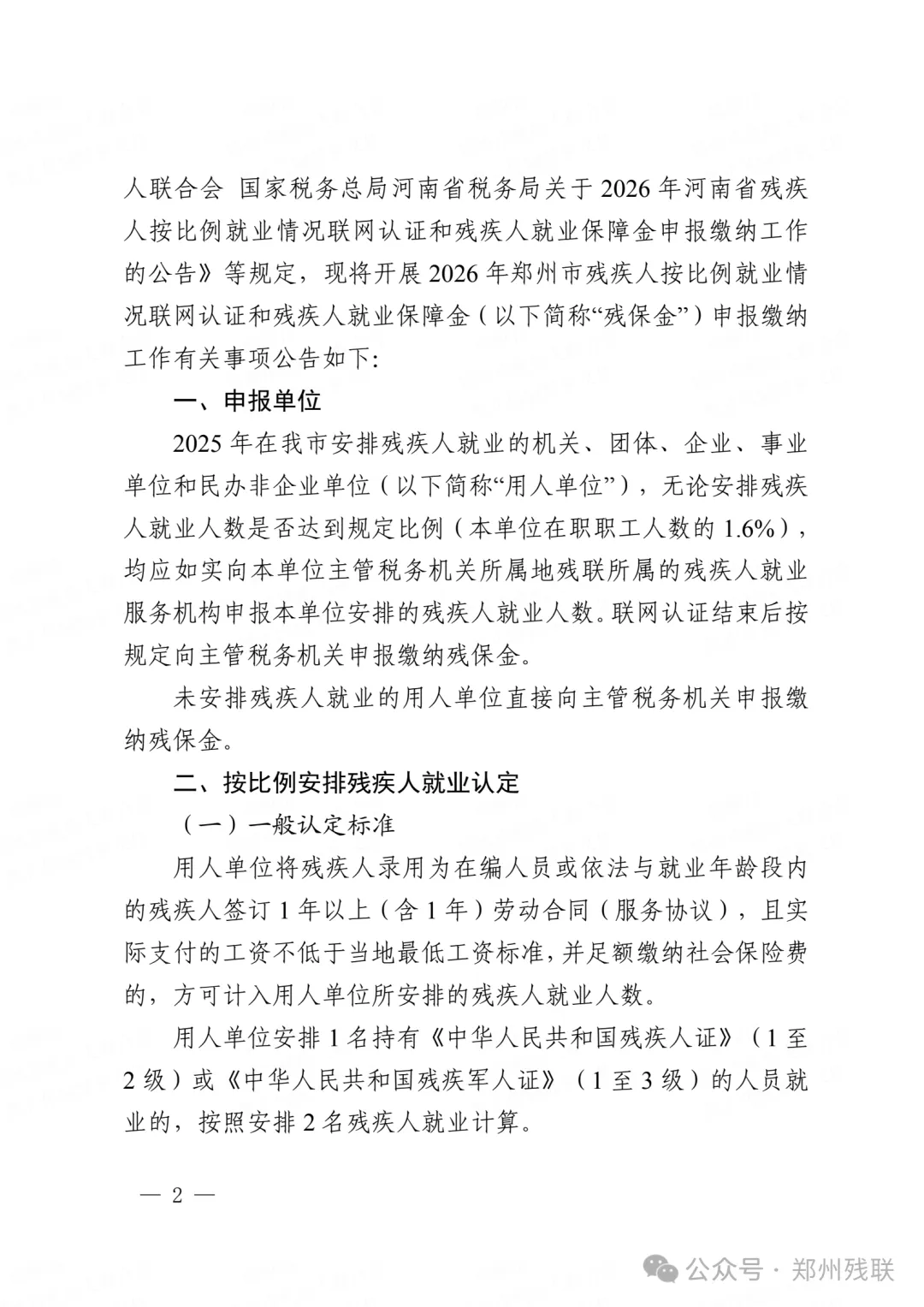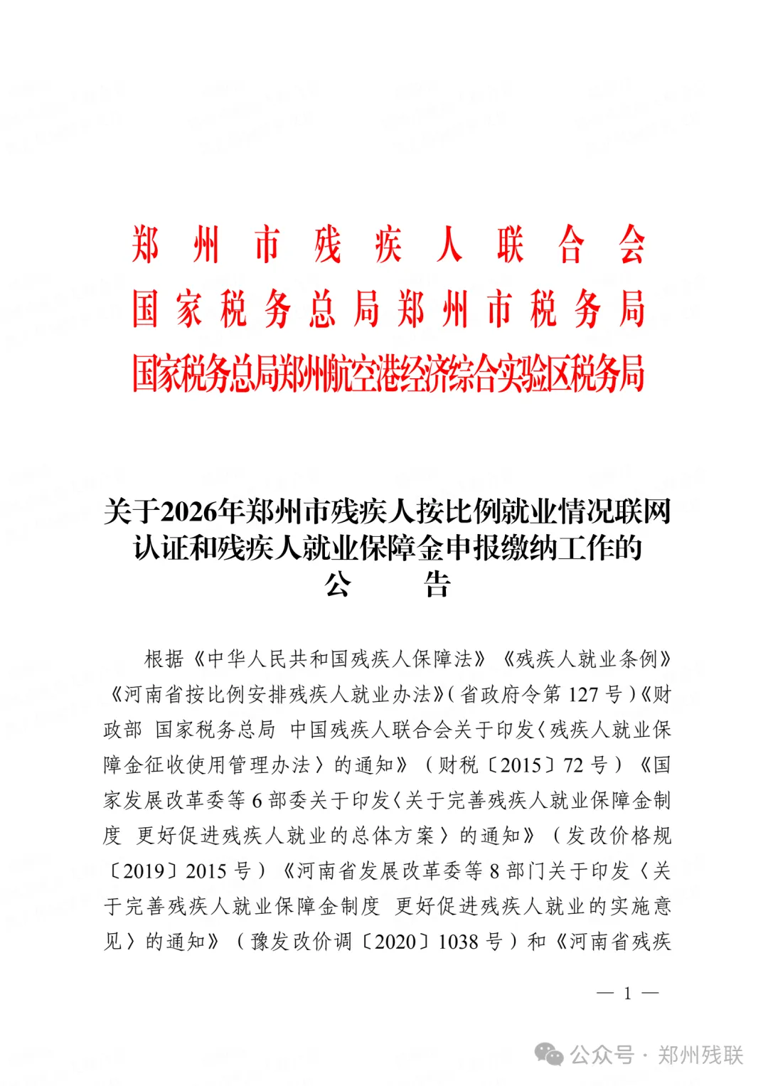 >关于2026年郑州市残疾人按比例就业情况联网认证和残疾人就业保障金申报缴纳工作的公 告