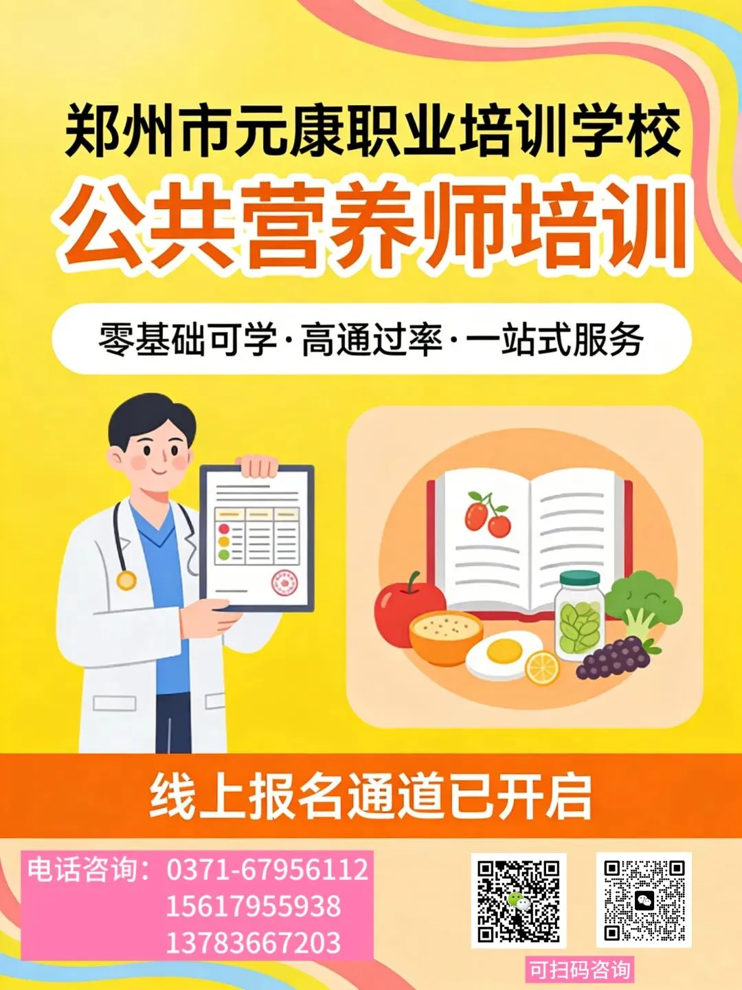 郑州市元康职业培训学校,始于1993年,是河南省老牌营养健康专业培训机构,专注公共营养师培训二十余年,依托三甲医院与高校专家师资、标准化课程体系、一站式报考与实习就业支持,面向全省开展中国营养学会公共营养师(四级/三级/二级)、人社公共营养师职业技能等级(四级/三级/二级) 全等级培训,助力学员持证上岗、职业进阶。
