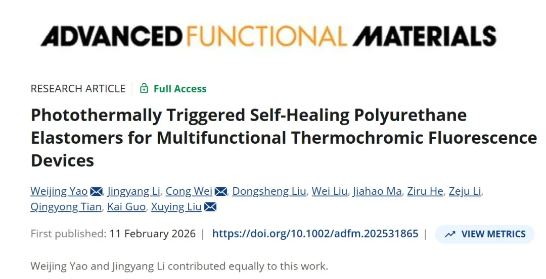 2026年2月11日,郑州大学姚伟睛副研究员、魏从副教授以及刘旭影教授团队在Advanced Functional Materials上发表了题为“Photothermally Triggered Self-Healing Polyurethane Elastomers for Multifunctional Thermochromic Fluorescence Devices”的研究成果。本研究提出一种光响应自修复以及变色荧光材料。通过在聚氨酯基体中引入光热转换材料以及温度响应变色荧光材料,实现光触发自愈合以及荧光变色。该体系展现了光热系统在信息防伪与先进光学器件中的应用潜力。