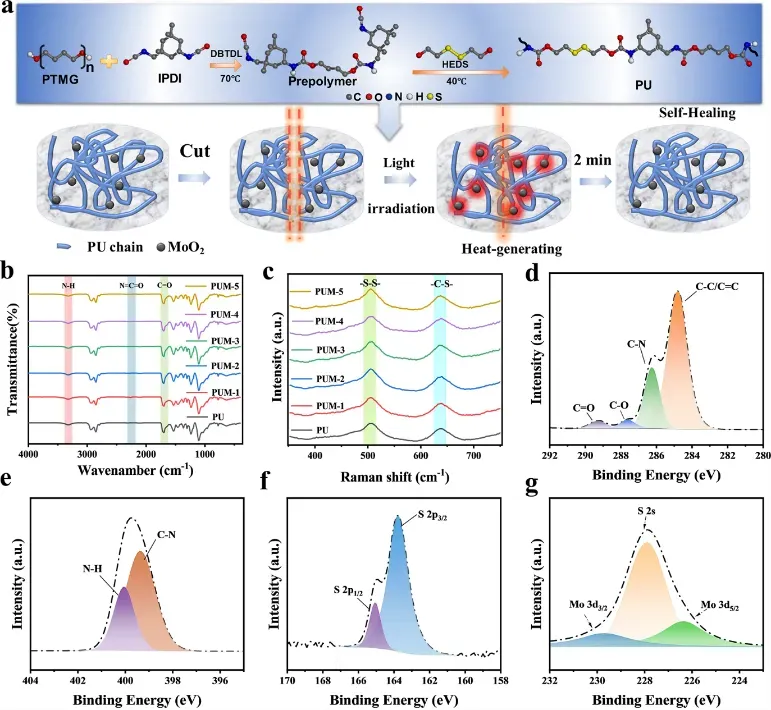 自愈聚合物材料在保护涂层和生物医学系统中备受关注。然而,大多数现有的自愈系统多依赖热激活,这限制了其在环境或局部条件下的适用性。本研究报道了一种光热触发的自愈合聚氨酯弹性体(PUM),将二氧化钼(MoO2)纳米材料整合进包含二硫键和氢键的动态聚合物网络中。它在阳光或近红外(NIR)照射下实现了宽谱光谱吸收,在此过程中MoO2能够高效地将光转化为局部热量,激活可逆键交换,从而实现快速、自主的损伤修复。(图1)