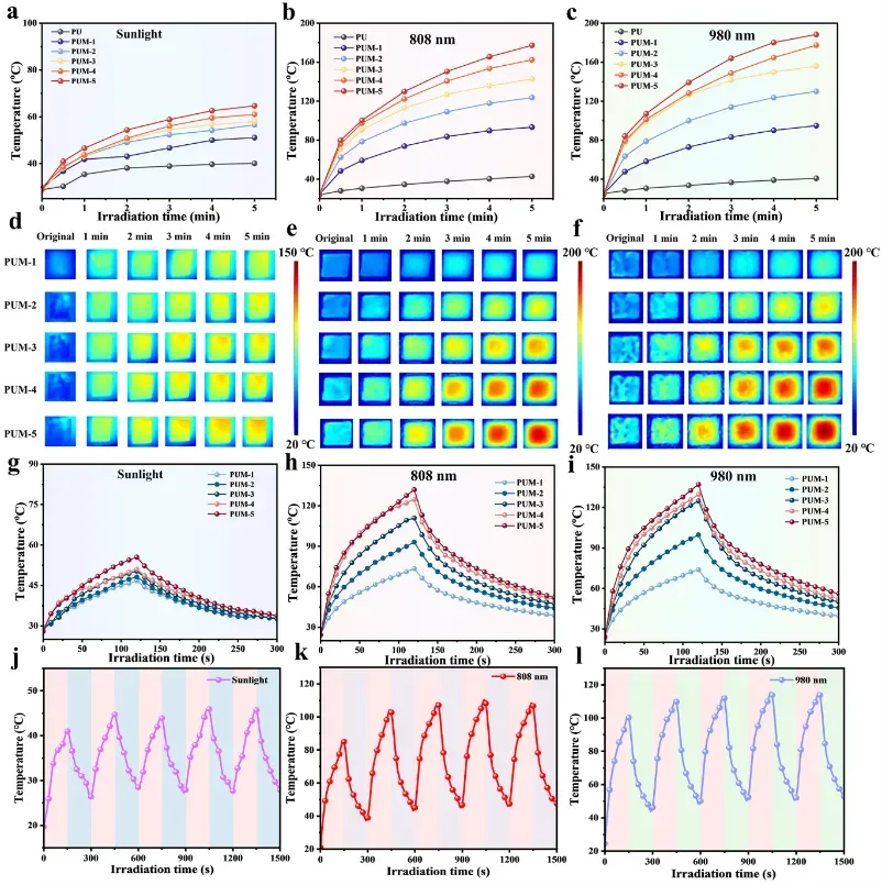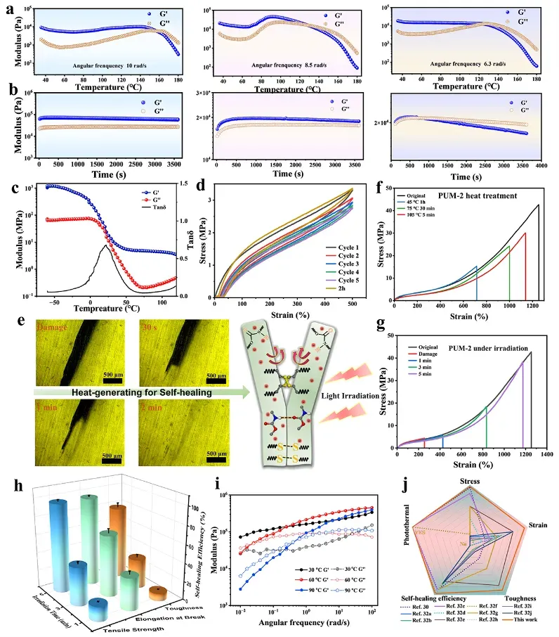 PUMs展现出良好的光热转换能力与光热稳定性,其在模拟太阳光和近红外光照下均能够实现快速升温,满足聚氨酯自愈合的需要。(图3)