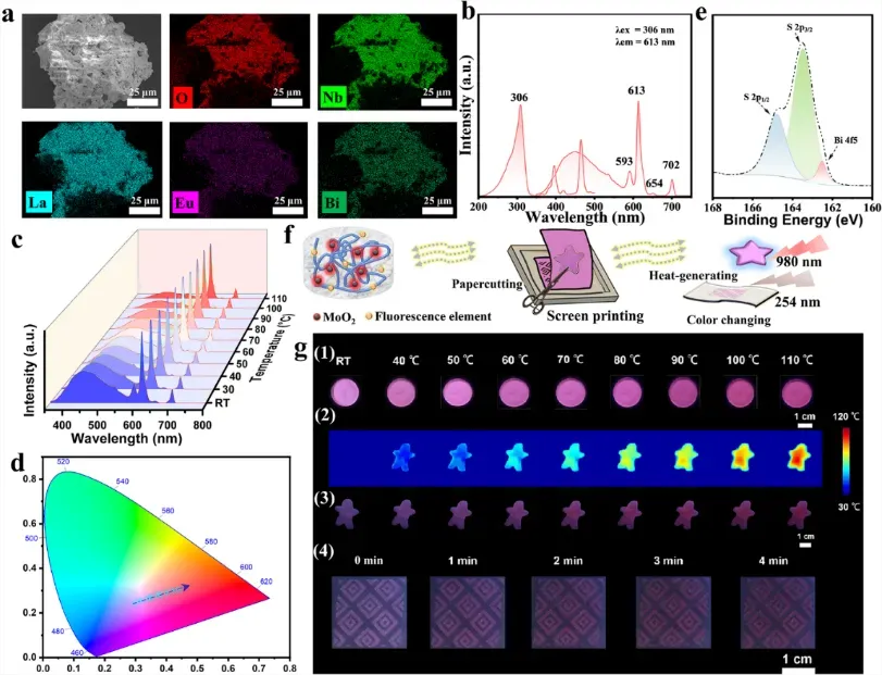 为进一步扩展功能,将热致变色荧光基团LaNbO4:1%Bi3+/0.5%Eu3+引入到PUM中,实现了在980nm照射下可逆变色荧光的信息防伪装置,其荧光颜色会随着温度的升高发生明显变化。FPUM可以很容易地加工成可打印的发光油墨,用于信息加密和光学显示领域。(图5)