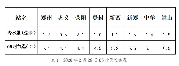 2月27日20时至28日06时,郑州市出现小雨。郑州市降水量0.5~2.9毫米,28日06时各站点气温0.5℃(嵩山)~5.6℃(新郑)(表1)。