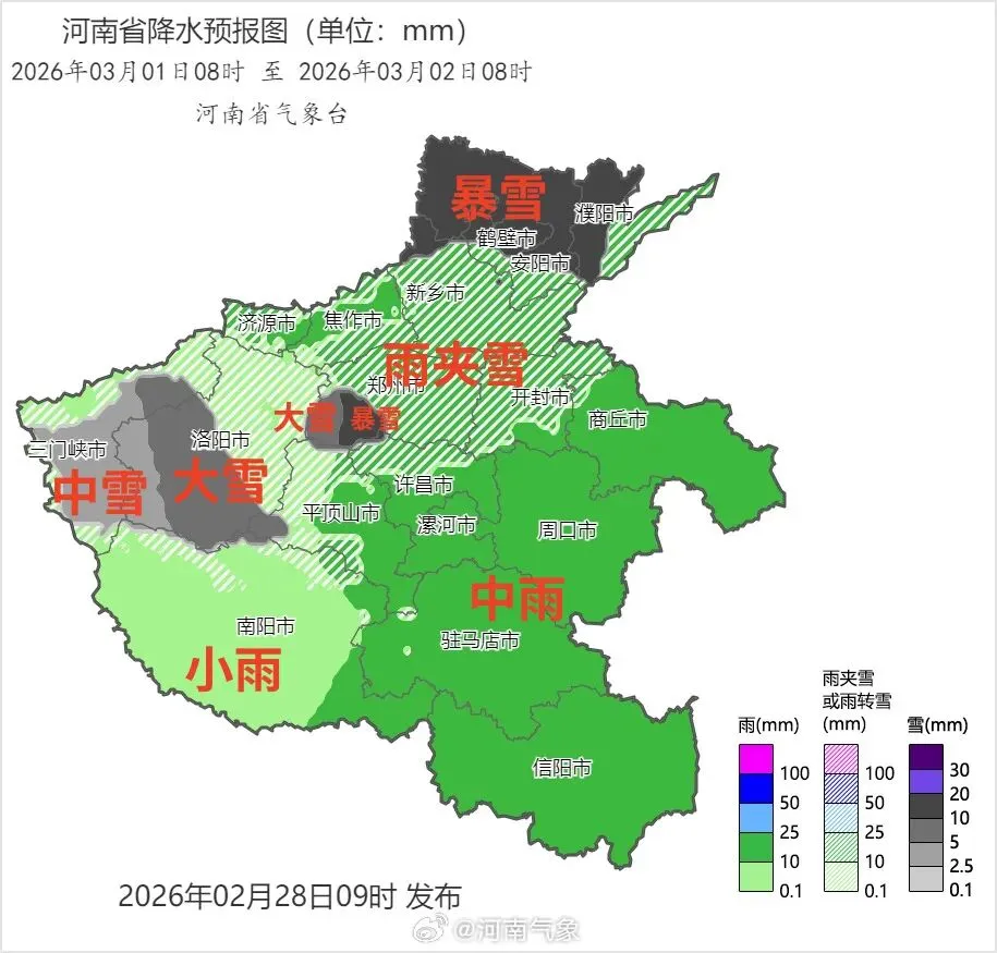 省气象台预计,28日白天到夜里,全省阴天,大部有小到中雨,其中安阳西部、新乡西北部、焦作北部、济源、三门峡、洛阳西部和中南部、南阳北部、郑州西部有雨夹雪或小到中雪,三门峡东南部、洛阳南部大雪,局部暴雪。