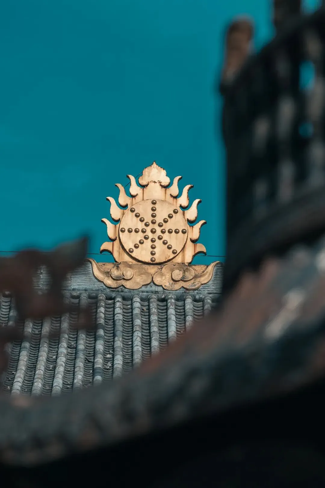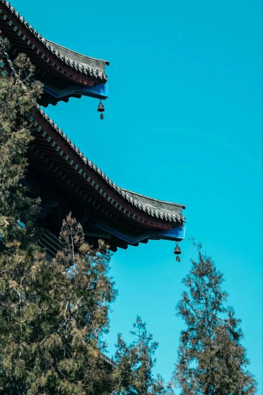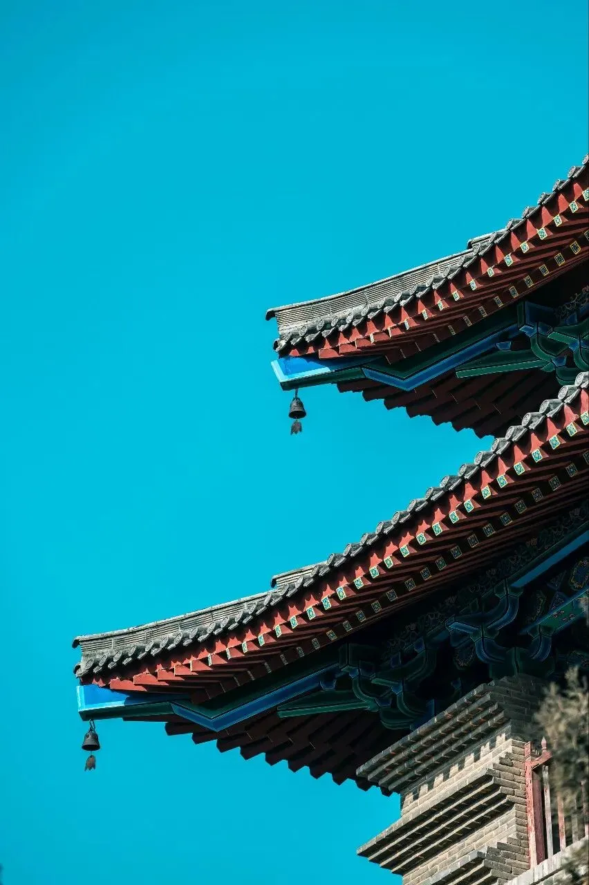 机位推荐:山门正面拍对称构图、飞檐仰拍(借蓝天当背景)、铜铃特写(虚化背景突出细节)