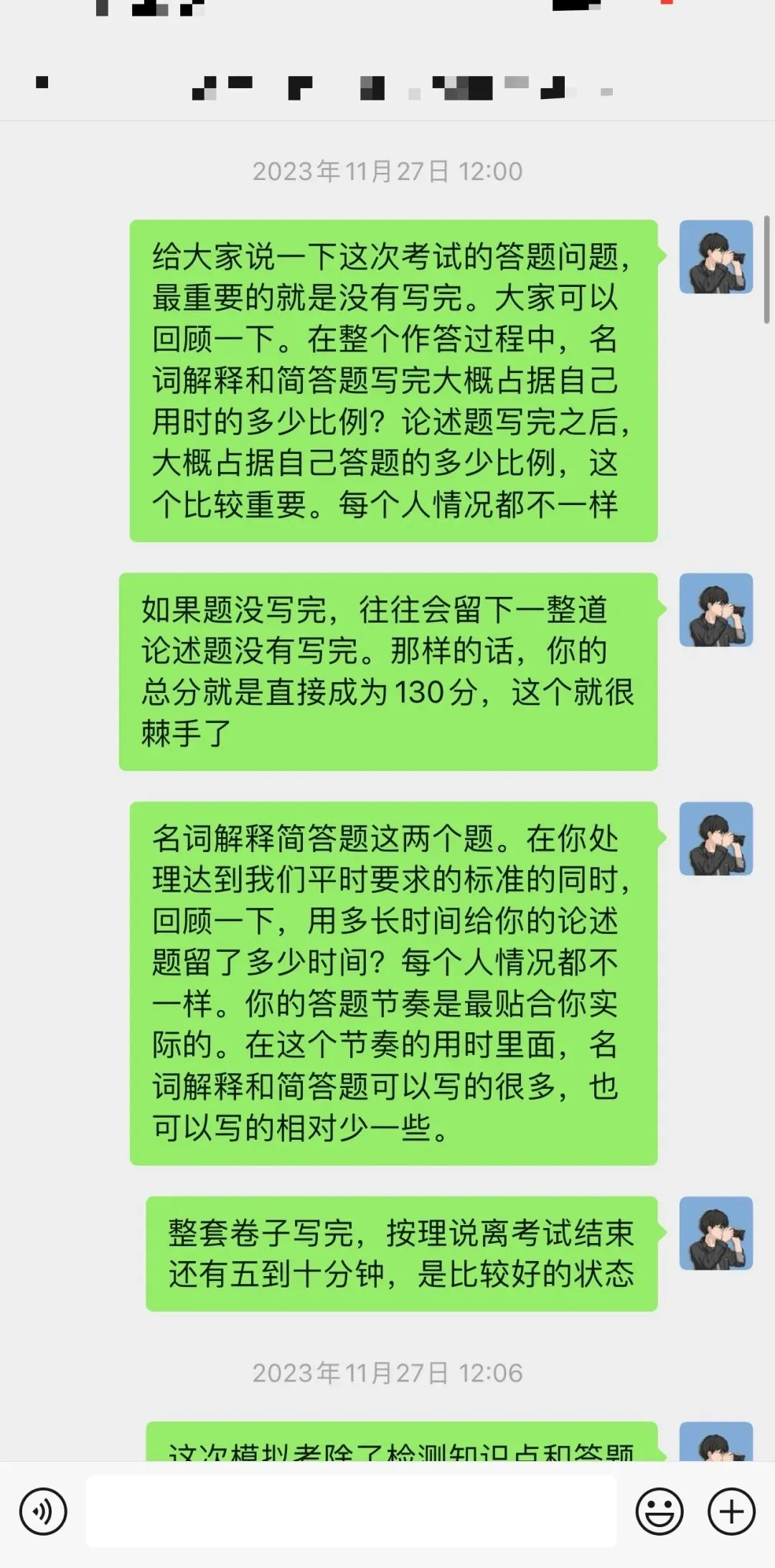 我们面对的对手不单单是同届考生和跨考生,还要面对二战、三战的考生,而“对手”却永远永远只是前面的一小部分人!这种情况下,只有在“正确”和“优秀”的方法指导下付出努力,取得了相关考试科目的“有效竞争分数”后,才有这人群中胜出一筹的机会。本工作室“郑州大学高分专项班”的授课内容和授课方式,皆建立在以往6年取得高分成绩的经验之上。两项课程中的各题型作答标准、卷面排列标准、论述题训练、诗词写作训练和模拟考试是我们取得高分的独有强项,也是课程班学员能够与其他考生拉开差距的关键阶段课程。