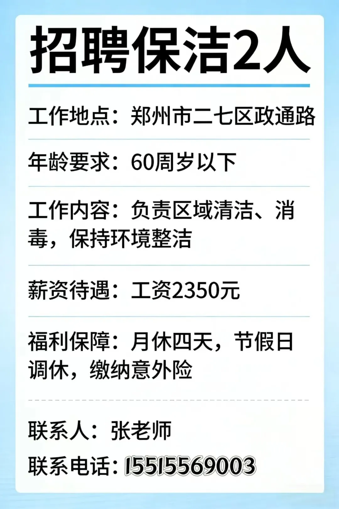 河南警察学院龙子湖校区图书馆、科研楼各招聘保洁员一名,工资2800元,月休四天,要求65岁以下身体健康女性,最好有工作经验,有意者请联系15837180587