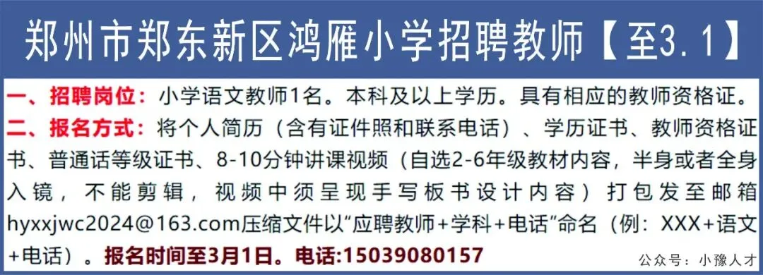 >郑州市郑东新区鸿雁小学招聘教师【至3.1】