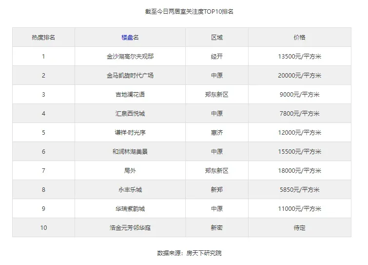 日前,郑州两居室排名结果出炉,据房天下研究院数据统计,郑州含有两居室楼盘