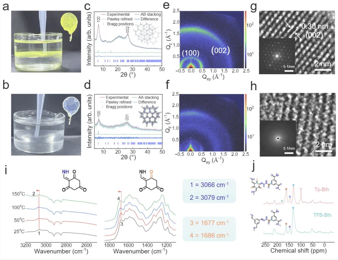 自支撑薄膜在自由两相界面处的光学照片(薄膜图像由线环拍摄),Tp-Bth 薄膜和 TFB-Bth 薄膜的实验、Pawley 精修及模拟 PXRD 图谱(两者的差异因子分别为:Tp-Bth,Rwp = 5.83%,Rp = 4.29%;TFB-Bth,Rwp = 16.74%,Rp = 12.9%),GIWAXS 数据,以及 Tp-Bth COF(a, c, e, g)和 TFB-Bth COF(b, d, f, h)的 HRTEM 图像(插图为 SAED 图案)。