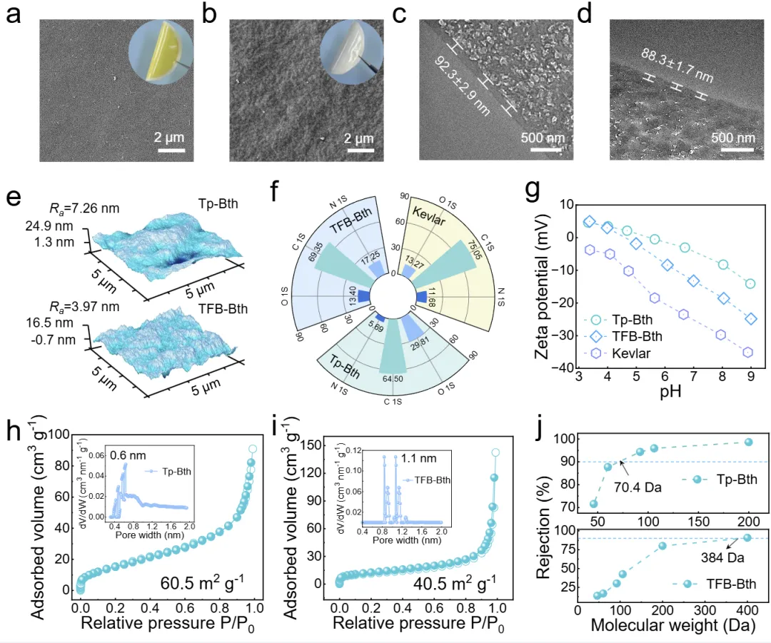 f–g Kevlar、Tp-Bth 和 TFB-Bth COF 膜的 XPS 光谱及 Zeta 电位。