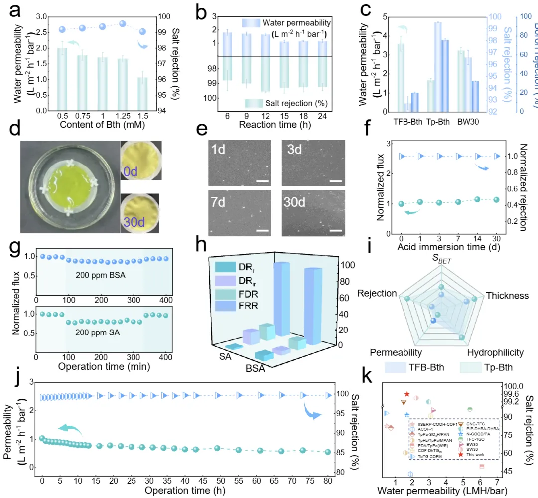 g 抗污染性能评估:以 BSA 和 SA 为模型污染物,Tp-Bth COF 膜的归一化水通量随运行时间的变化。污染测试分为三个阶段:(1) 用 2000 ppm NaCl 进料液采集水通量基线;(2) 用含 200 ppm 模型污染物的 2000 ppm NaCl 进料液记录污染时的通量;(3) 用去离子水冲洗膜后,用 2000 ppm NaCl 进料液评估通量恢复情况。