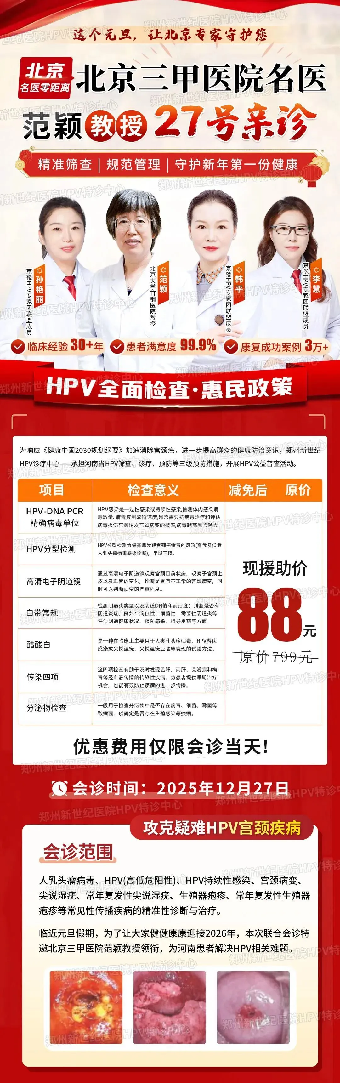 为响应国家防癌号召,郑州新世纪医院HPV诊疗中心将于2025年12月27日特别开展“北京名医联合会诊”活动。