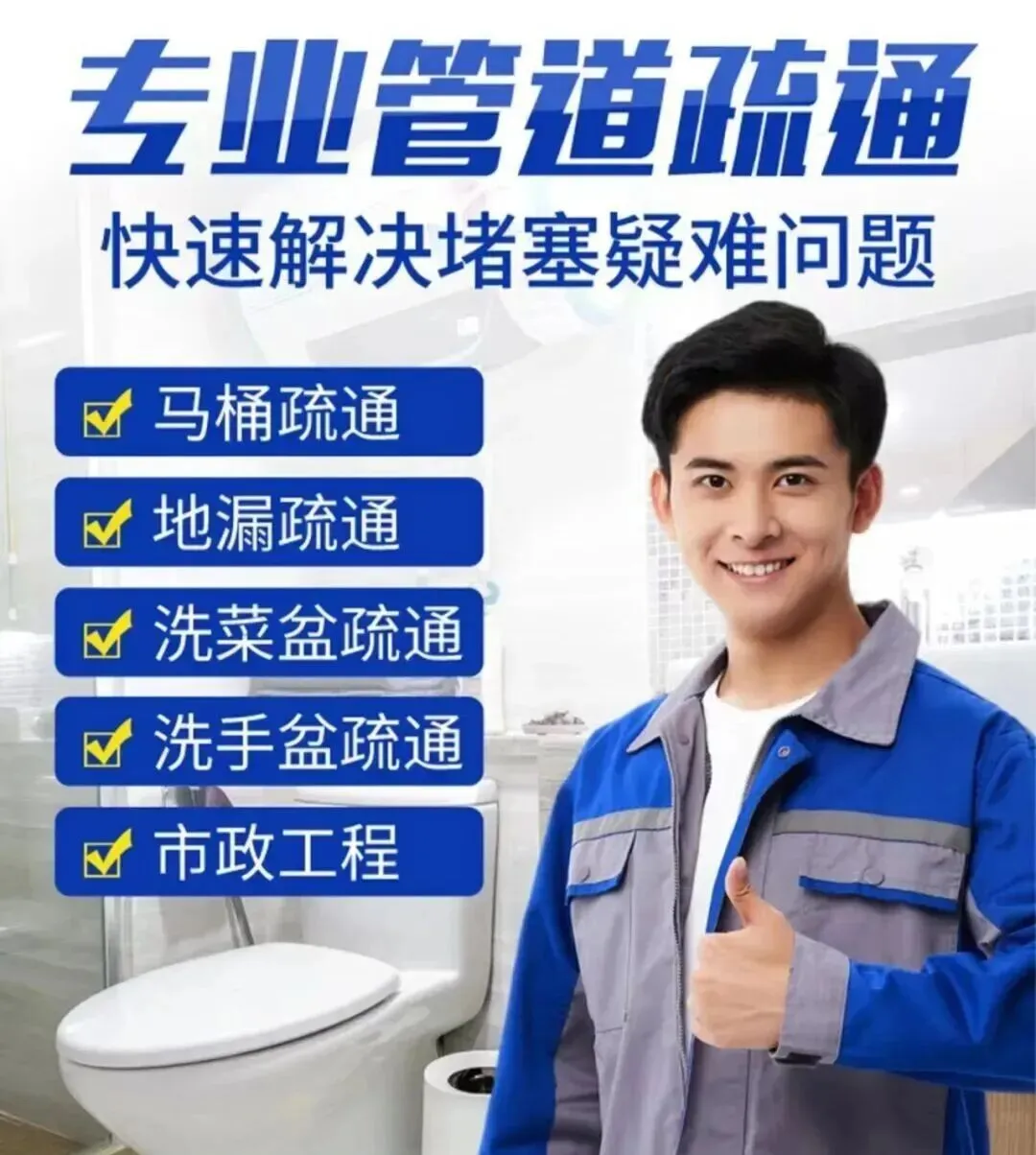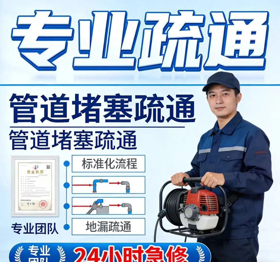 管道疏通:使用家用疏通机、大型疏通机等设备,专业疏通各类疑难下水道、卫生间、地漏、浴缸、菜池、阴沟、马桶、蹲坑等。