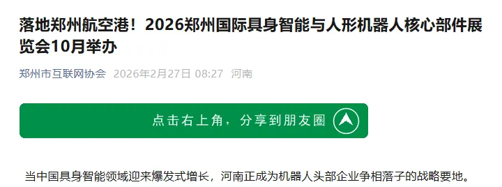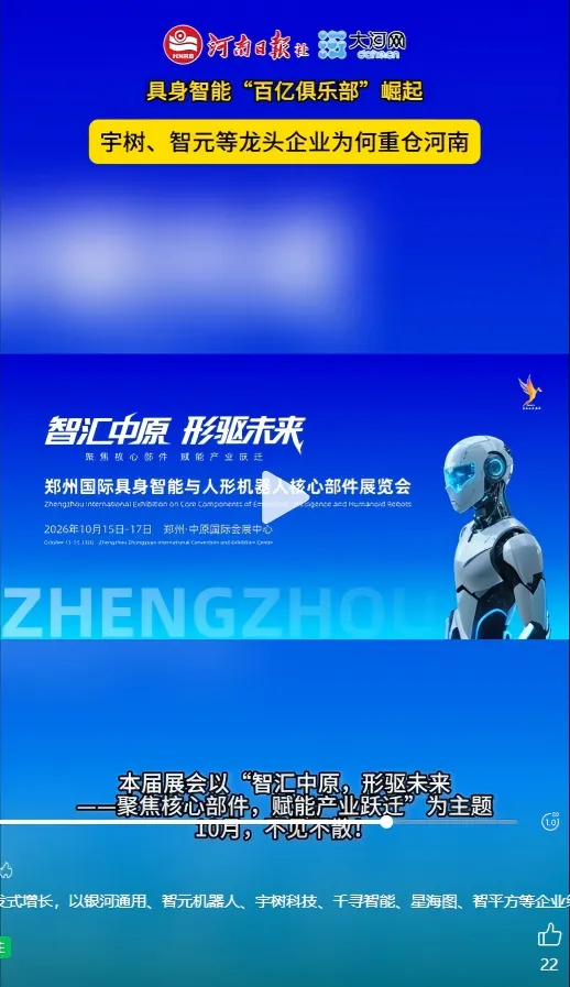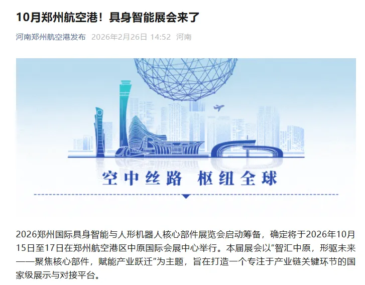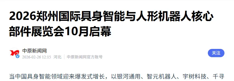 2026年10月15日至17日,当全球具身智能领域的创新力量汇聚郑州航空港区中原国际会展中心,当精密减速器、高性能伺服电机、六维力传感器、灵巧手等核心部件同台亮相,当行业专家、头部企业、应用需求在此碰撞——这不仅是技术与产品的展示,更是从“婴儿蹒跚学步”到“产业爆发蓄力”的集体见证。