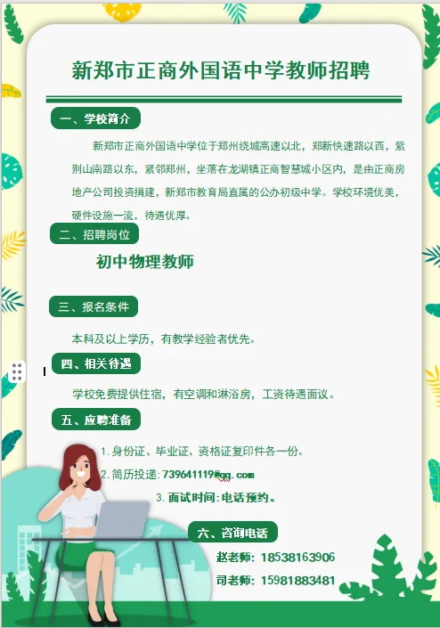 郑州某优质公办中学代课教师招聘信息(提供食宿)