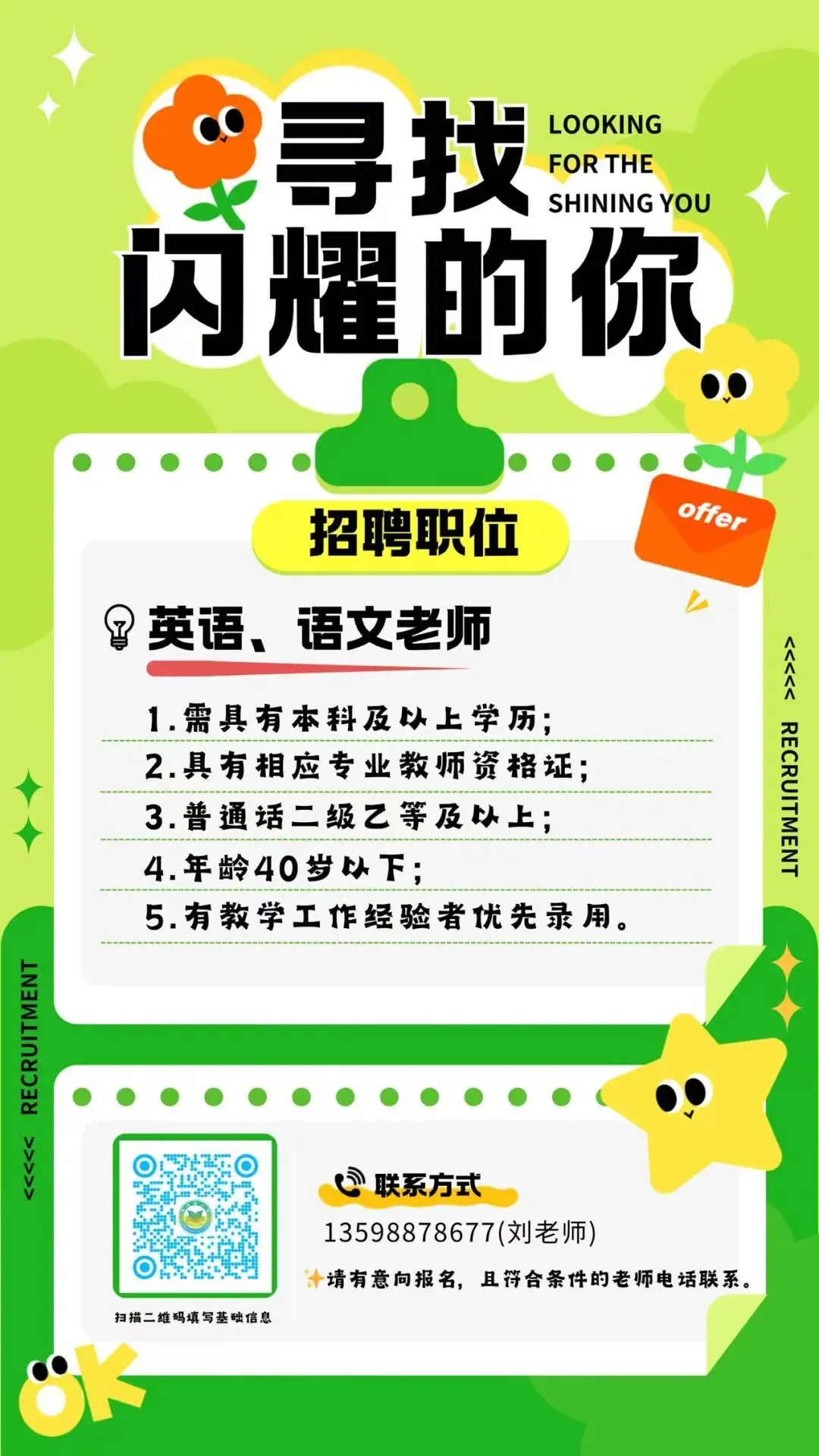 1.本科及以上学历,持有教师资格证、普通话证、毕业证、学位证;