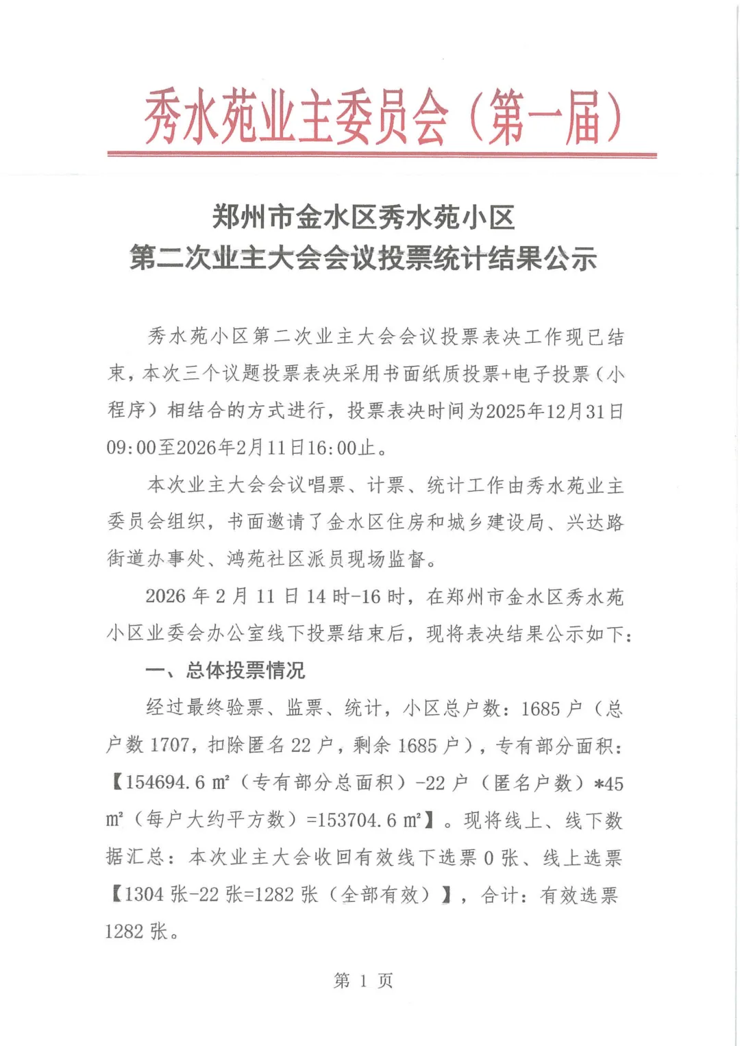 秀水苑小区第二次业主大会会议投票表决工作现已结束,本次三个议题投票表决采用书面纸质投票+电子投票(小程序)相结合的方式进行,投票表决时间为2025年12月31日09:00至2026年2月11日16:00止。