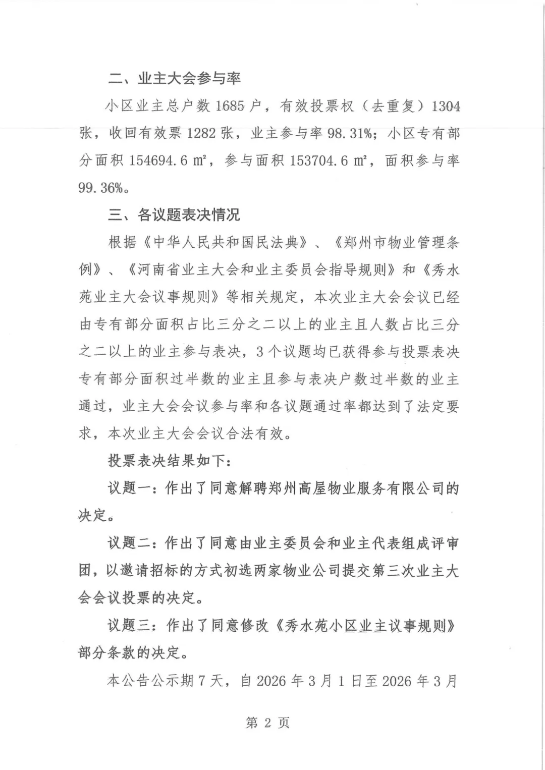 根据《中华人民共和国民法典》、《郑州市物业管理条例》、《河南省业主大会和业主委员会指导规则》和《秀水苑业主大会议事规则》等相关规定,本次业主大会会议已经由专有部分面积占比三分之二以上的业主且人数占比三分之二以上的业主参与表决,3个议题均已获得参与投票表决专有部分面积过半数的业主且参与表决户数过半数的业主通过,业主大会会议参与率和各议题通过率都达到了法定要求,本次业主大会会议合法有效。