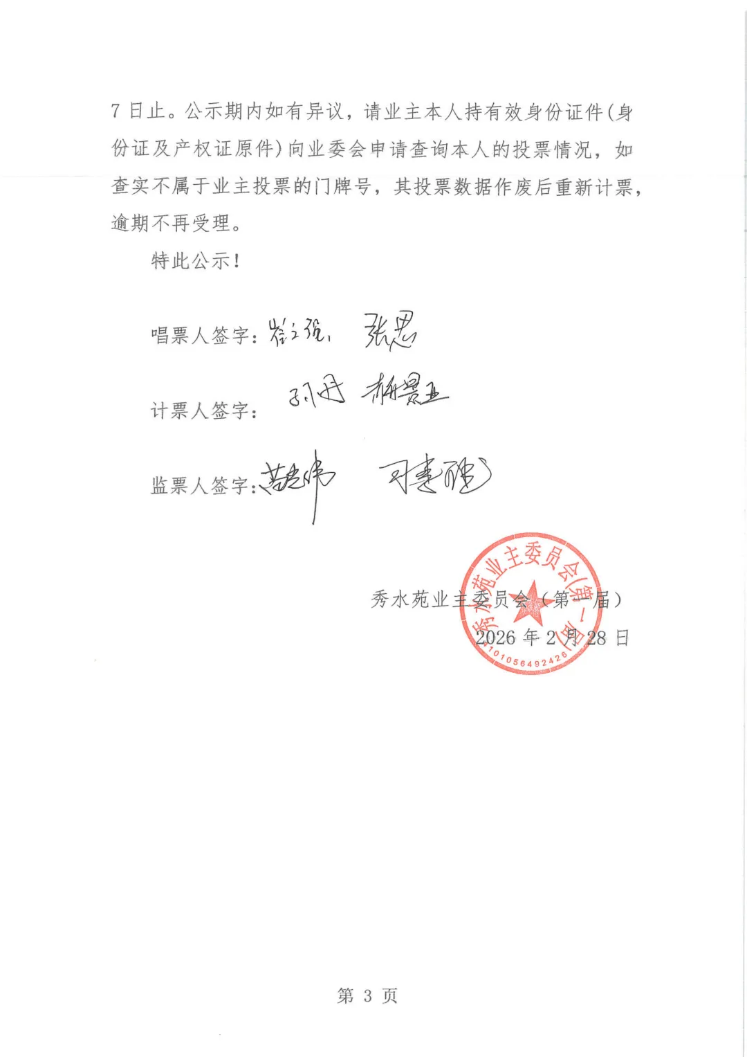 本公告公示期7天,自2026年3月1日至2026年3月7日止。公示期内如有异议,请业主本人持有效身份证件(身份证及产权证原件)向业委会申请查询本人的投票情况,如查实不属于业主投票的门牌号,其投票数据作废后重新计票,逾期不再受理。