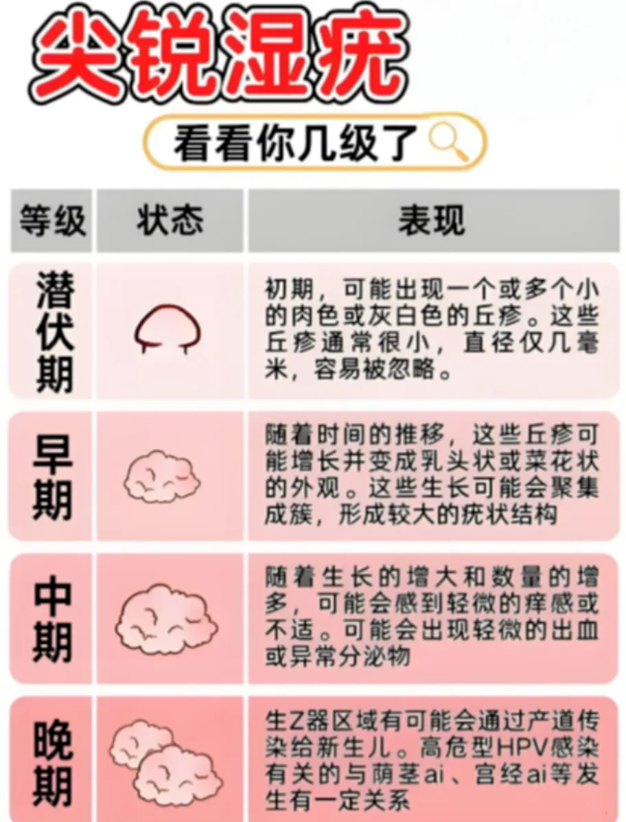 症状开始“清晰显现”。小丘疹长成乳头状、菜花状或鸡冠状赘生物,颜色变为淡红或污灰色,表面粗糙如砂纸,稍摩擦就易破损。疣体数量增多并融合成大片隆起,摩擦后糜烂渗液,伴有轻微瘙痒或灼痛感。此时病毒复制活跃,传染伴侣风险显著提高。