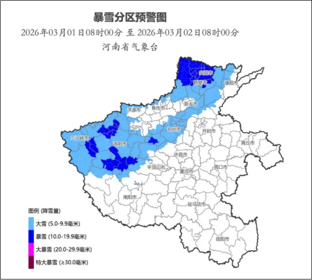 河南省气象台发布暴雪蓝色预警:郑州中西部、新乡、洛阳等地将出现5毫米以上降雪