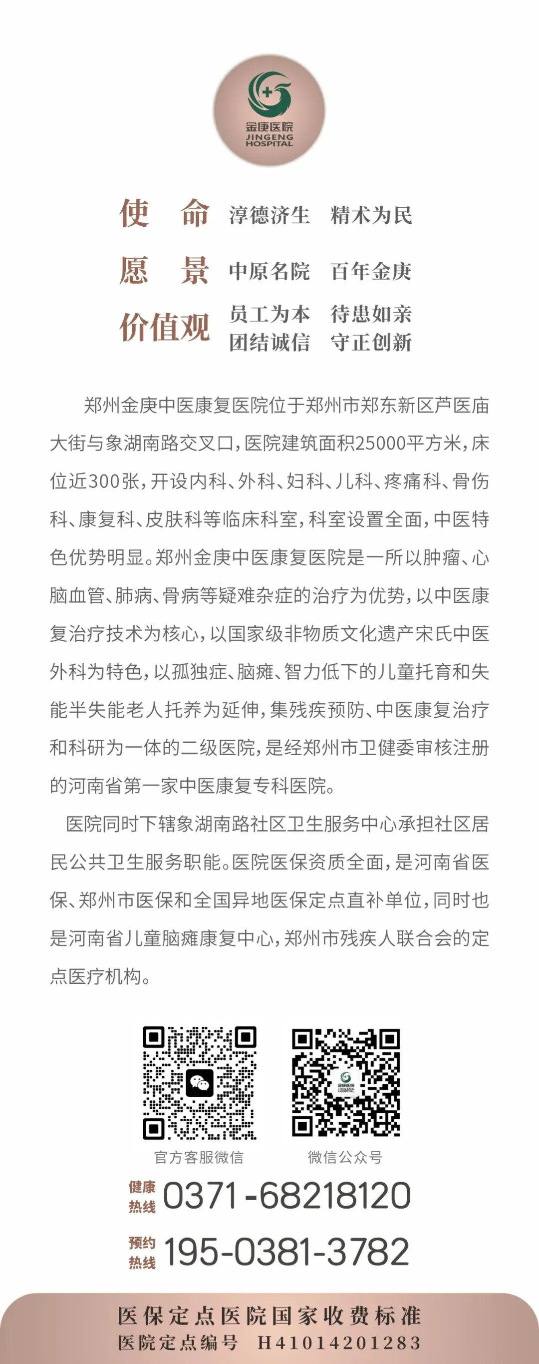 医院始建于1981年,前身是国医大师宋金庚先生创办的宋氏中医外科门诊,后于2002年由宋氏中医第六代传人宋兆普先生创建了汝州市金庚康复医院,2019年入驻郑州成立郑州金庚中医康复医院。金庚医院始终秉承“淳德济生、精术为民”的使命,坚守“员工为本、待患如亲、团结诚信、守正创新”的价值观,为患者除病痛,为员工造平台,奋力实现“中原名院、百年金庚”的愿景!