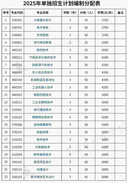 1.学校2025年高职单独考试招生安排招生计划1000人,招生专业及分专业计划以河南省教育厅审核批复后公布的高职单独考试招生章程为准。 2.学校2025年高职单招安排退役士兵单列计划20人,单列计划招生专业为运动健康指导(7人)、体能训练(8人)、新能源汽车技术(5人)三个专业。退役士兵考生在单列计划内择优录取