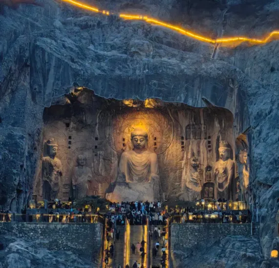 北魏孝文帝迁都后开凿的,武则天又把奉先寺做大,卢舍那大佛那张脸,日头一照,像在看人。