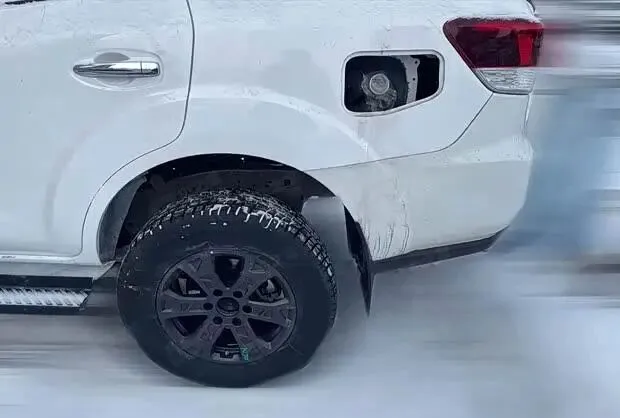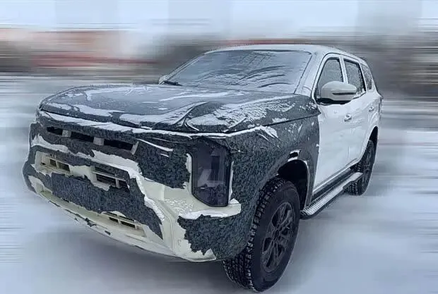 新车整体车身轮廓与现款车型基本一致,但在车头部分进行了全新设计。前脸造型更为方正硬朗,格栅尺寸进一步加大,并采用分层式布局。大灯组为竖置式设计,灯体进行了熏黑处理。从轮胎位置可以清晰看到车身的“大梁”结构,印证了其非承载式SUV的身份。