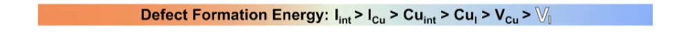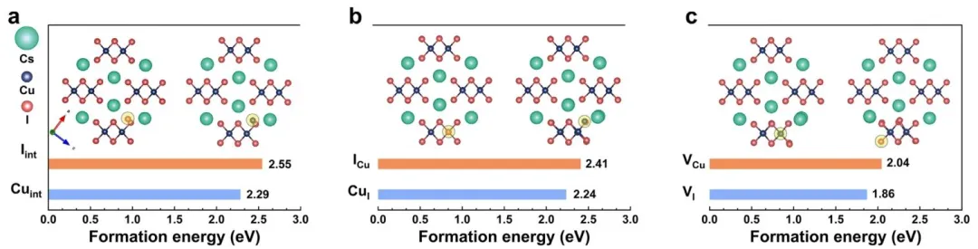 制备高质量CsCu₂I₃薄膜仍面临溶液处理多晶薄膜中存在多种类型缺陷的挑战,这些缺陷源于CsCu₂I₃不可控的结晶过程。通过密度泛函理论(DFT)计算,比较了CsCu₂I₃中与Cu和I相关的本征点缺陷(包括间隙(Cu_int和I_int)、反位(Cu_I和I_Cu)和空位缺陷(V_Cu和V_I))的形成能。发现V_I在带隙中产生深能级,吸引电子/空穴并作为Shockley-Read-Hall非辐射复合中心,影响载流子复合动力学并导致PLQY降低。因此,有效钝化此类缺陷对于增强CsCu₂I₃的光电性能至关重要。